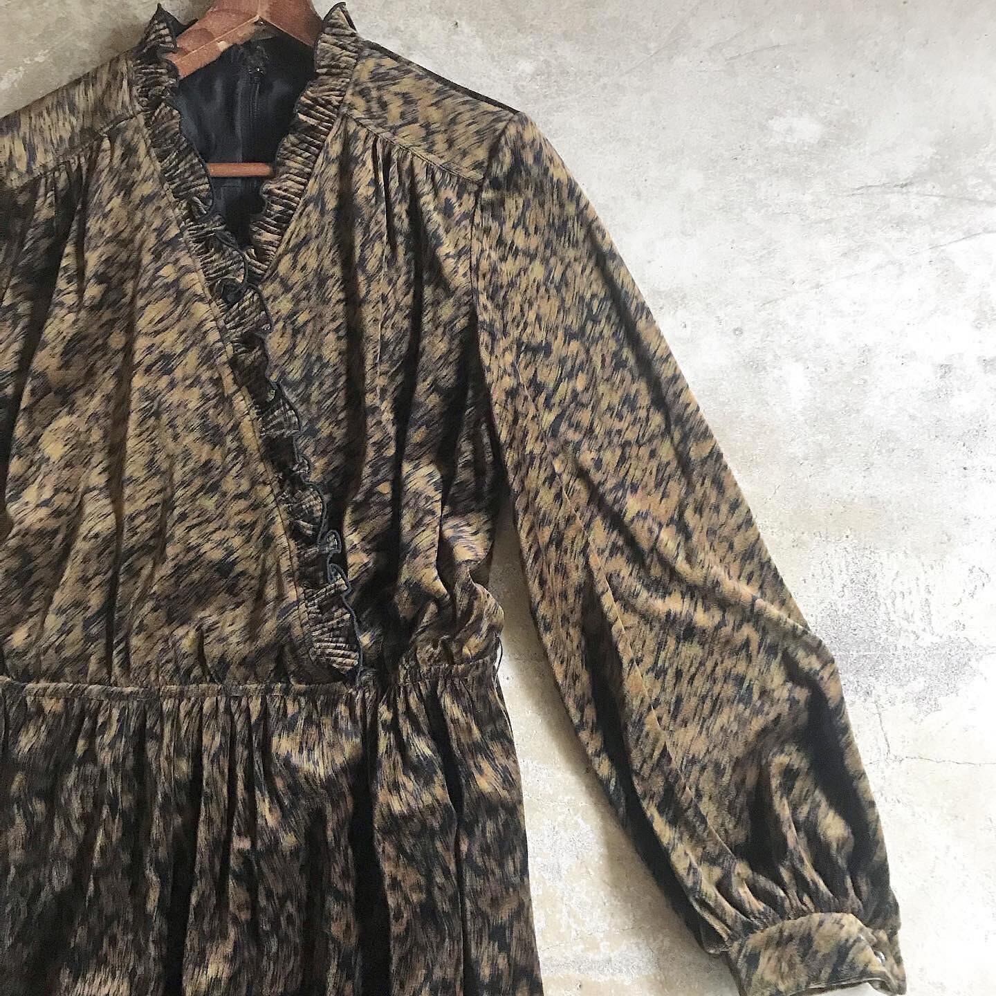光の当たり方で微妙に表情が変わる、ベロア独特の色合いがステキなワンピース。すっきりとしたカシュクールのデザインが印象的です。控えめなフリル使いとレオパードのような柄が大人っぽく、様々な雰囲気でお楽しみいただけます。柔らかくあたたかみのあるベロア素材です。袖部分以外に裏地が付いています。