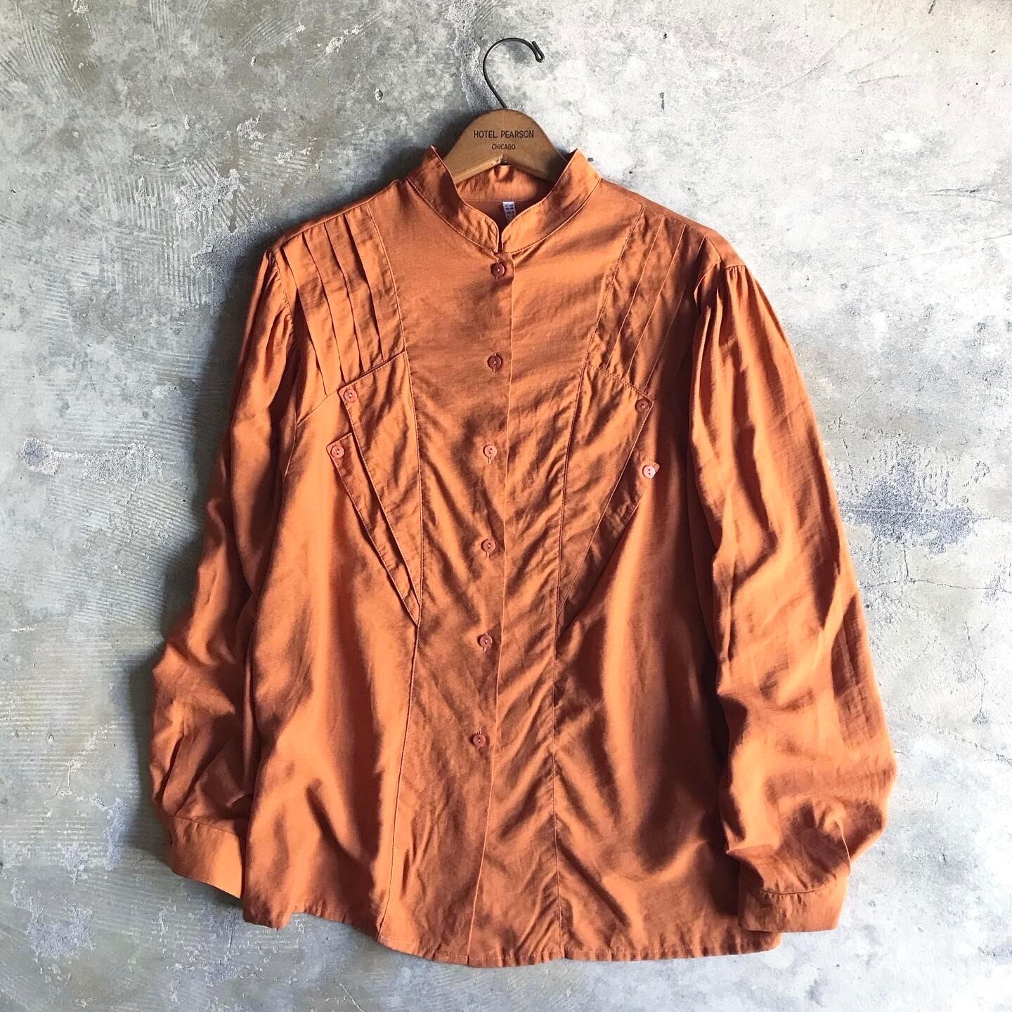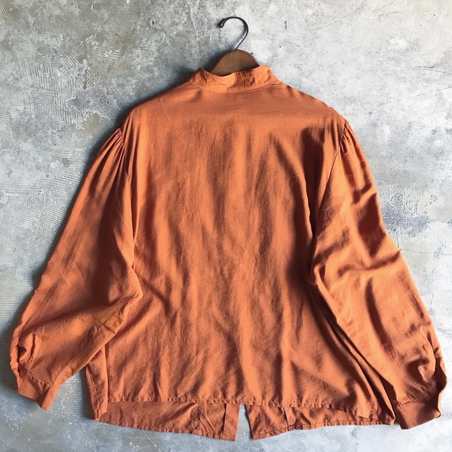 すっきりとしたスタンドカラーの首元と落ち着いた色合いが大人っぽい雰囲気のシャツジャケット。フロントの凝ったデザインと、ふんわりとしたボリュームスリーブが印象的です。ゆったりとしたサイズ感なので、ハイネック等をインナーにレイヤードするのもオススメです。さらりとしたしなやかな素材感です。