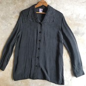 襟のデザインが素敵なブラウス。古着らしいあたたかみのあるチャコール系ブラックがよい雰囲気です。ゆるやかなサイズ感なので、インナーにハイネック等をレイヤードするのもオススメです。さらりとしたしなやかな素材感です。