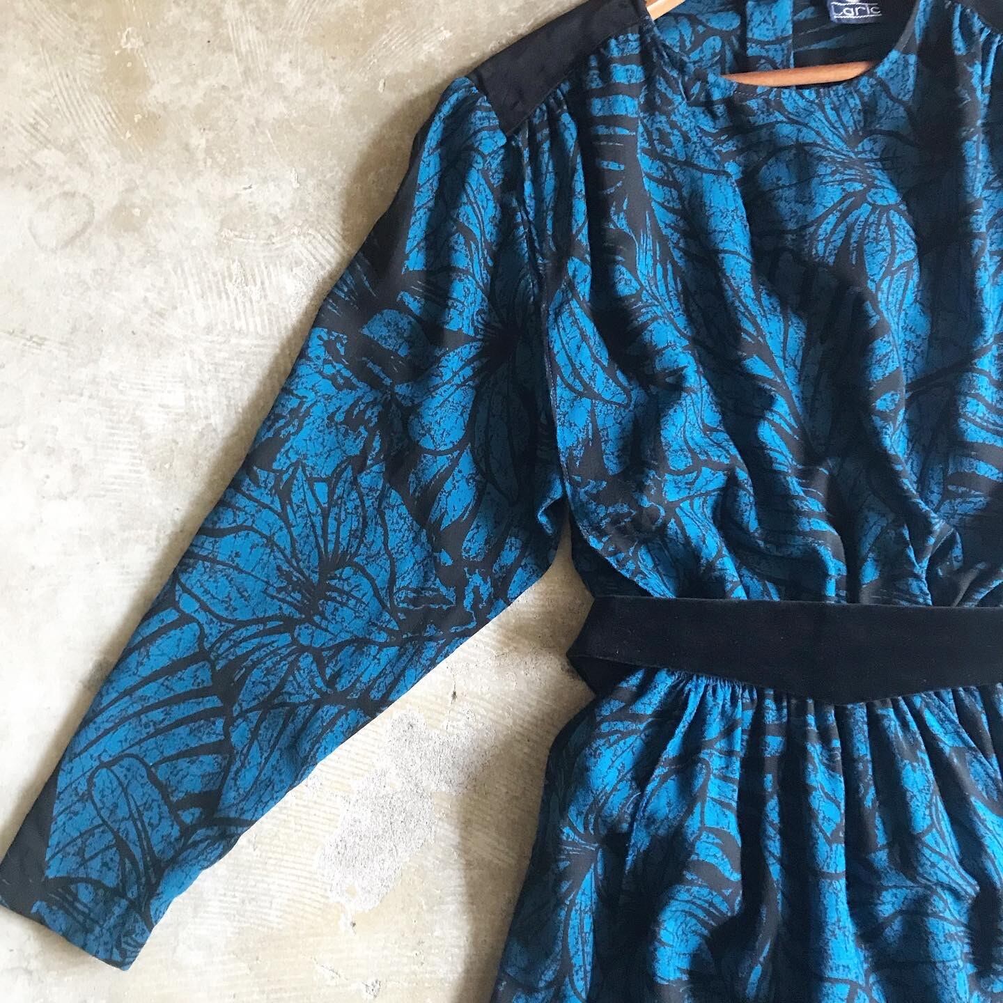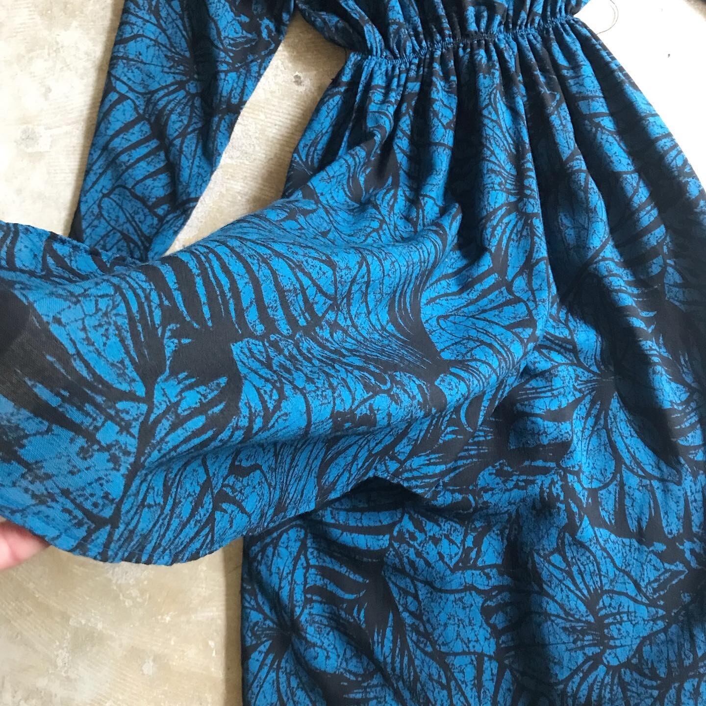 ほんのりグリーンを感じるあたたかみのあるブルー系の色合いが素敵なワンピース。肩と付属ベルトのベロア使いが、さりげないアクセントになっています。ふんわりボリュームのある袖や、フロントの2枚重ねのデザイン等、少し凝ったデザインが印象的な1着です。柔らかくしなやかな素材感です。スカート部分には裏地が付いています。