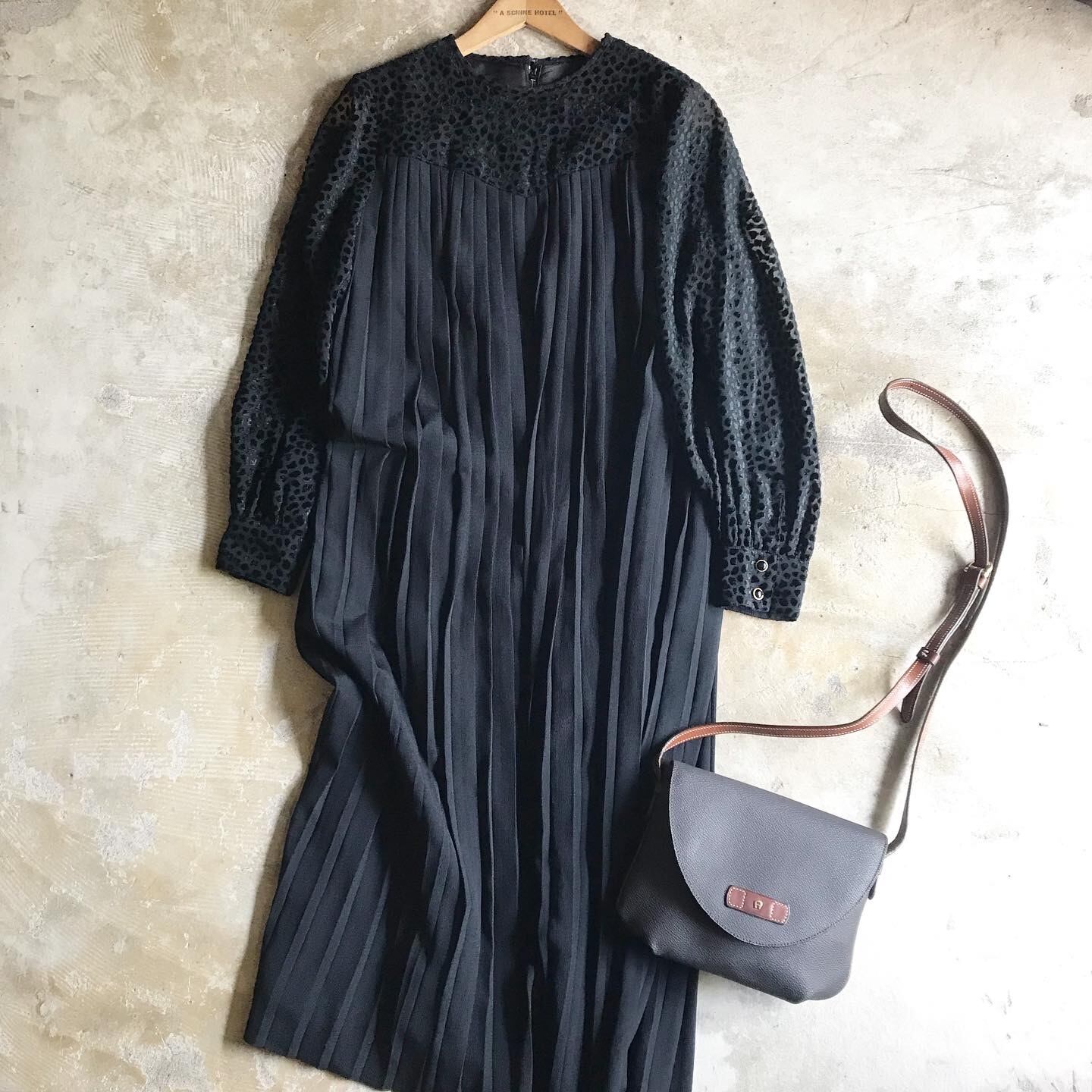 細かなプリーツが素敵なブラックワンピース。袖部分は透け感のあるデザインになっています。自然に下に落ちるシルエットが大人っぽい雰囲気です。ウエストの位置にベルトループが付いているので、お持ちのベルトでウエストマークするのもオススメです。パンツを合わせてカジュアルに普段使いはもちろん、きれいめなドレスとしてもお使いいただけます。さらりとしたしなやかな素材感です。袖部分以外に裏地が付いています。