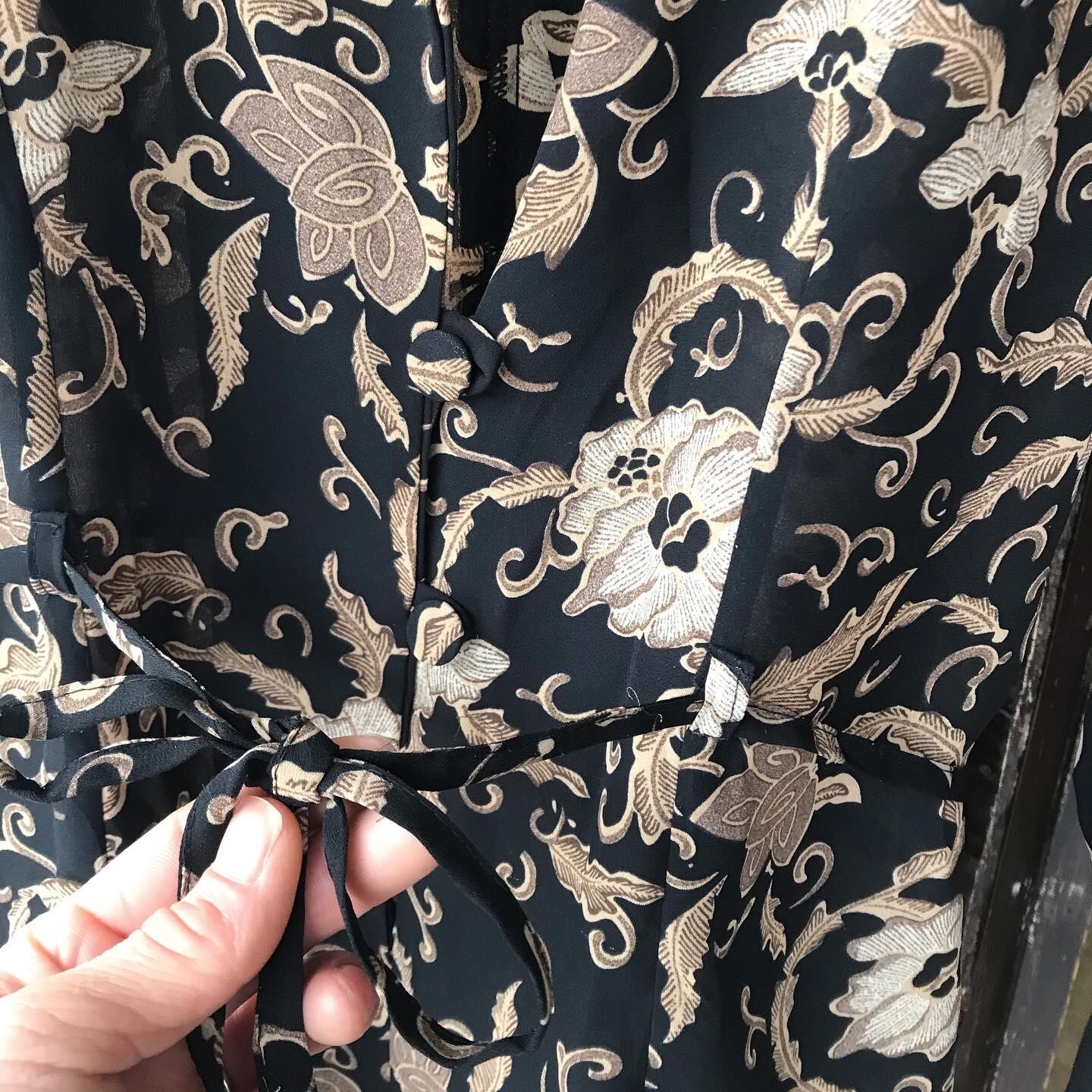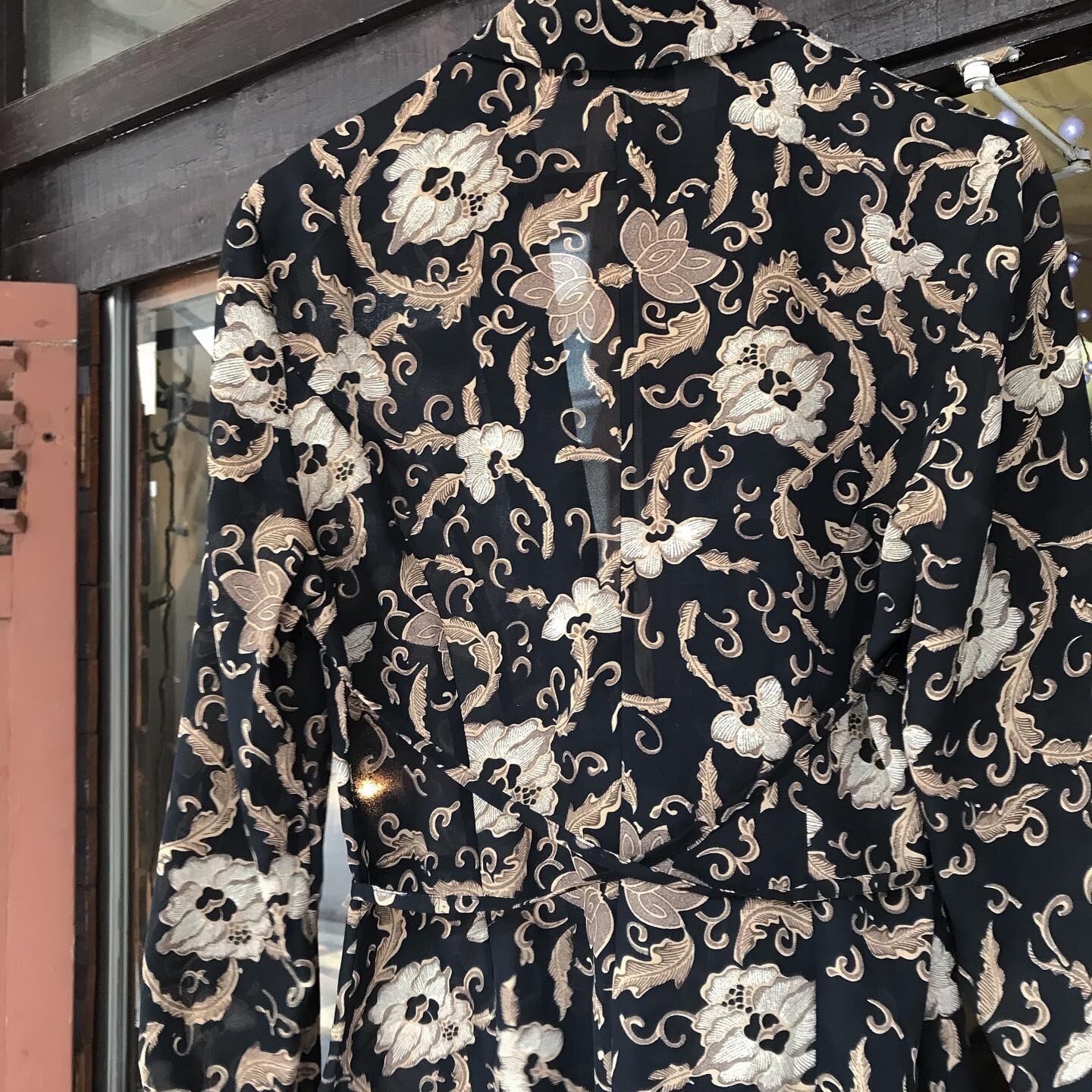 ブラックに近いシックなネイビーベースに描かれた柄が素敵なシャツジャケット。紐ベルトを結ぶことでウエストマークできるデザインになります。背中でクロスされた紐ベルトも、さりげないアクセントになっています。きれいめにはもちろん、Tシャツとデニムパンツにさらりと羽織るカジュアルコーデもオススメです。少し透け感のある、さらりとしたしなやかな素材感です。