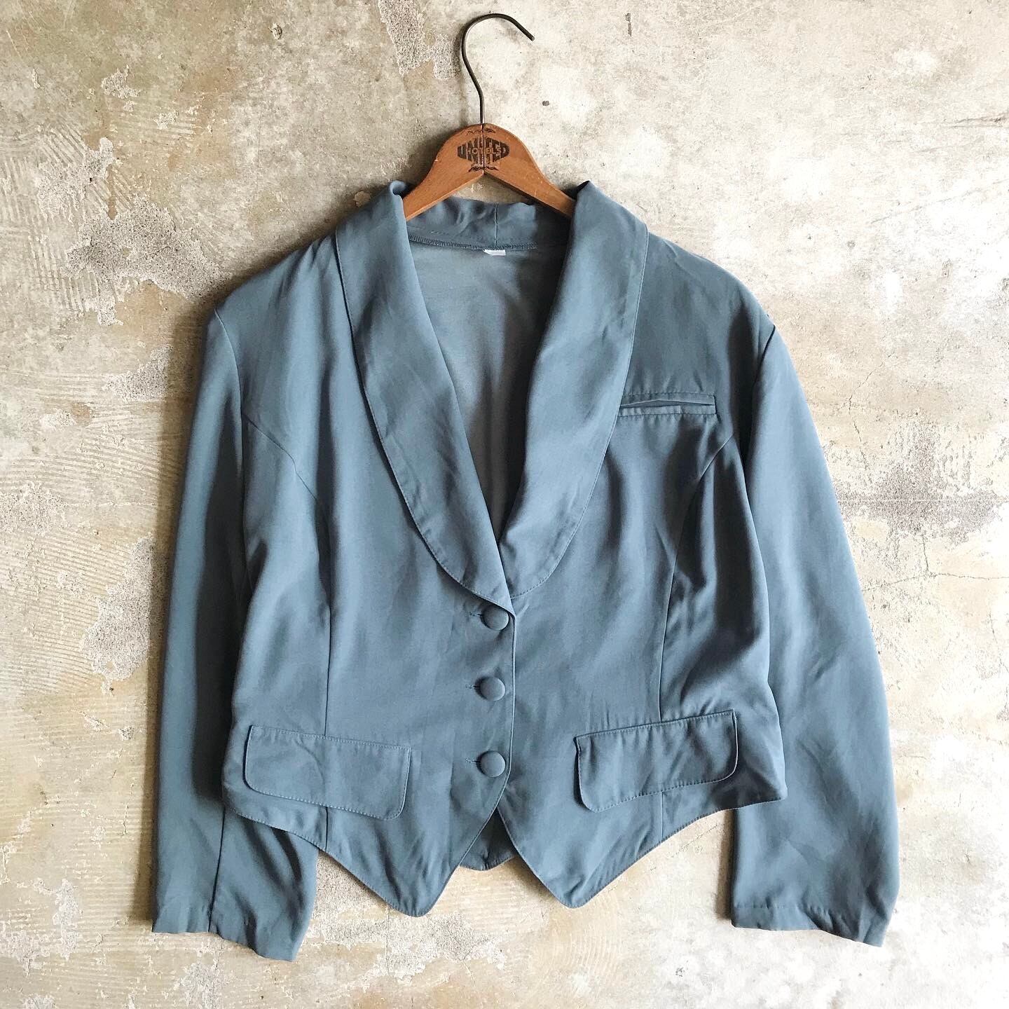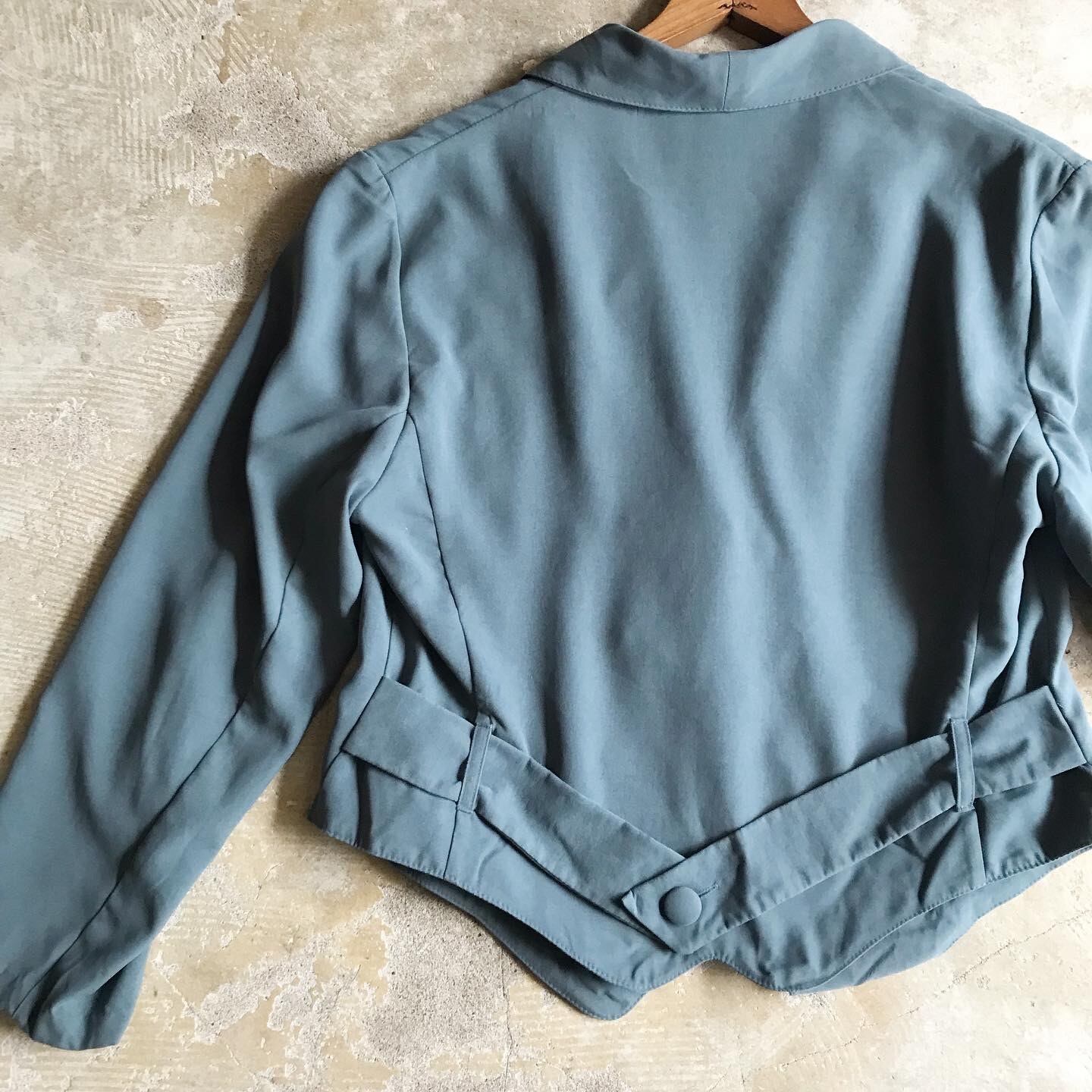 ほんのりグリーンを感じるくすんだ色合いが素敵なショート丈ジャケット。すっきりとした裾と、後ろのベルトのデザインが印象的です。丸いくるみボタンと、フェイクポケットがさりげないアクセントになっています。きれいめにはもちろん、Tシャツ・デニムにさっと羽織るカジュアルコーデもオススメです。柔らかく、さらりとしたしなやかな素材感です。