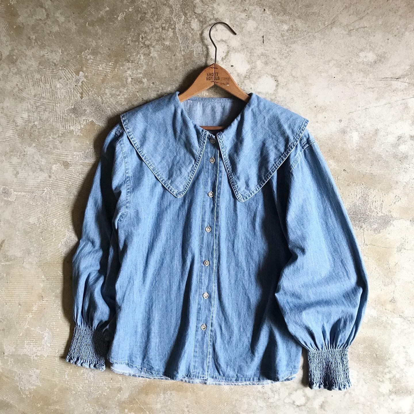 肩にかかる大きな襟と、手首で自然に止まるゆるやかなボリュームスリーブが可愛いブラウス。デニムのカジュアル感が甘めな雰囲気を軽減してくれて、様々なアイテムとのカジュアルコーデでお楽しみいただけます。Tシャツ等にさらっと、軽めなジャケットのように羽織るのもオススメです。厚手すぎない柔らかなデニム素材で、幅広い季節でお楽しみいただけます。