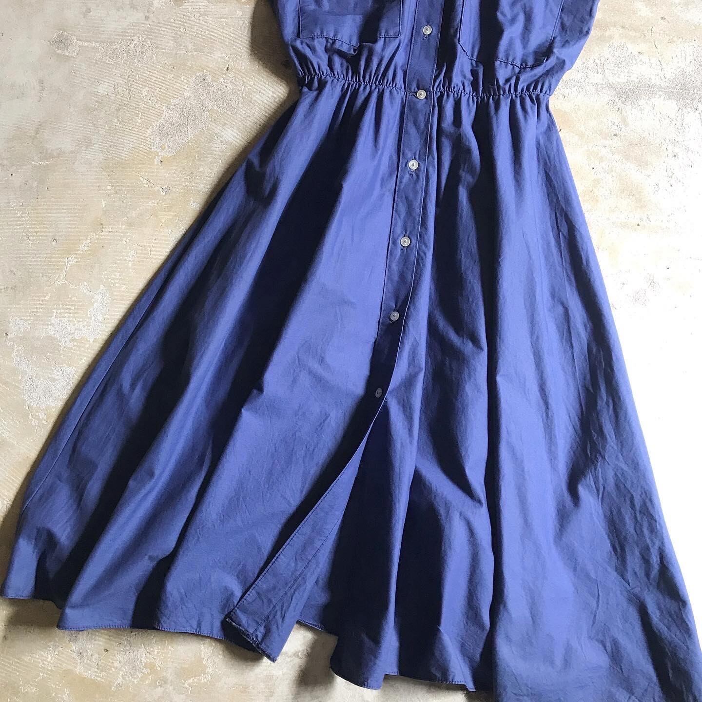 ブルーとネイビーの中間くらいの落ち着いた色合い。すっきりとしたシャツデザインの首元と、生地をたっぷり使ったフレアなスカート部分。この絶妙なバランスが可愛いワンピースです。