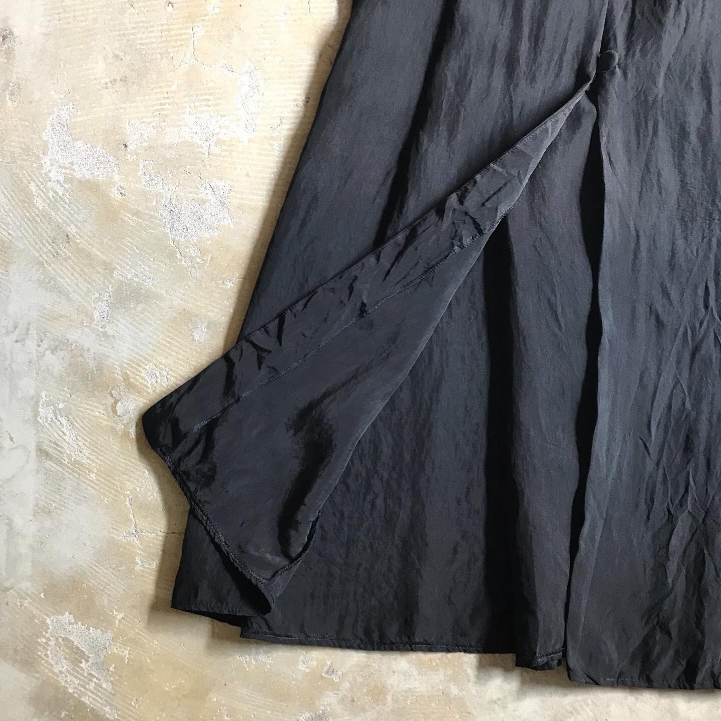 チャコールに近い柔らかなブラックの発色と、しなやかな素材感が素敵なワンピース。自然に下に落ちるデザインが大人っぽい雰囲気です。フロントボタンをあけて、Tシャツとパンツにさらっと羽織るレイヤードコーデもオススメです。背中のレースアップの結び加減でシルエットの変化もお楽しみいただけます。さらりとしたしなやかな素材感です。裏地は付いていません。ほぼ透け感はありませんが、光の当たり方によっては透けることがあることと、フロントボタンが膝上の箇所で終わっている為、気になる方はインナーやボトムスとの重ね着をお勧め致します。