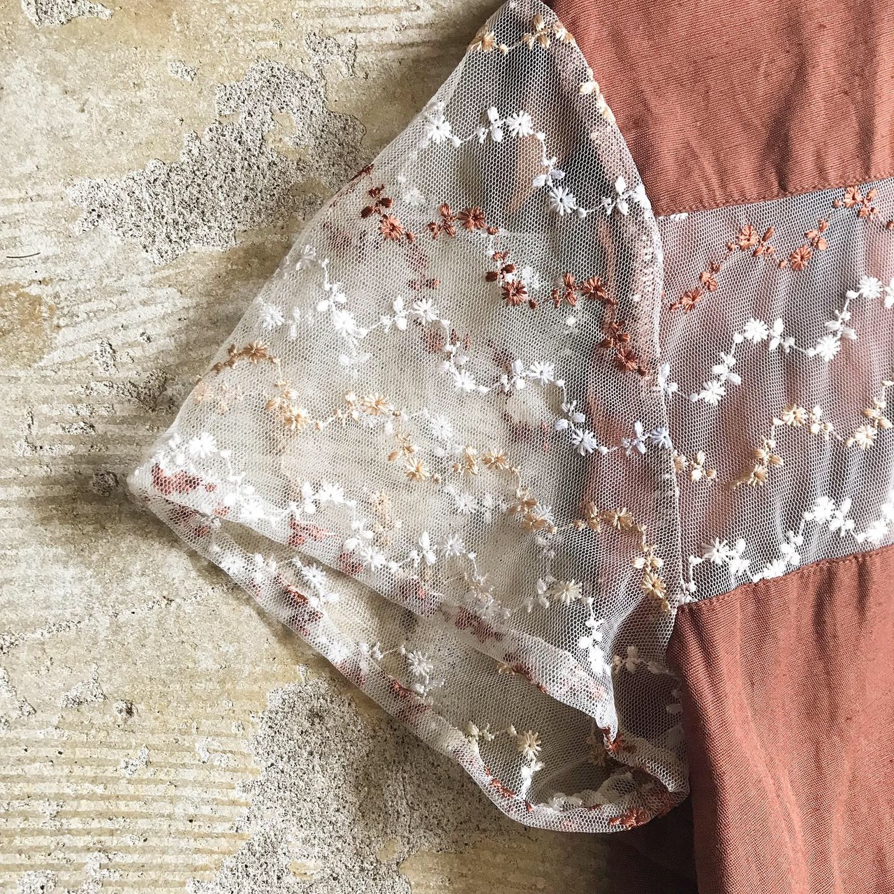 ブラウン系の落ち着いた色合いのコットンリネンに、オフホワイトのチュールの透け感がミックスされたデザインが素敵なブラウス。フロントと袖のチュール部分には細かな刺繍がほどこされています。インナーとのレイヤードコーデで、きれいめにもカジュアルにも、様々な雰囲気でお楽しみいただけます。さらりとした肌触りのよい素材感です。