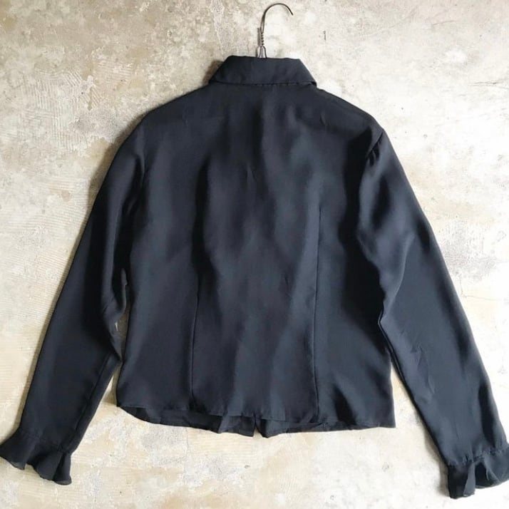 フロントのボリュームのあるフリルが素敵なシアーブラウス。シックなブラックの色合いなので、甘くならずクールな印象です。インナーとのレイヤードで様々な雰囲気でお楽しみいただけます。デニムパンツ等とカジュアルにコーディネートするのもオススメです。透け感のある、さらりとしたしなやかな素材感です。