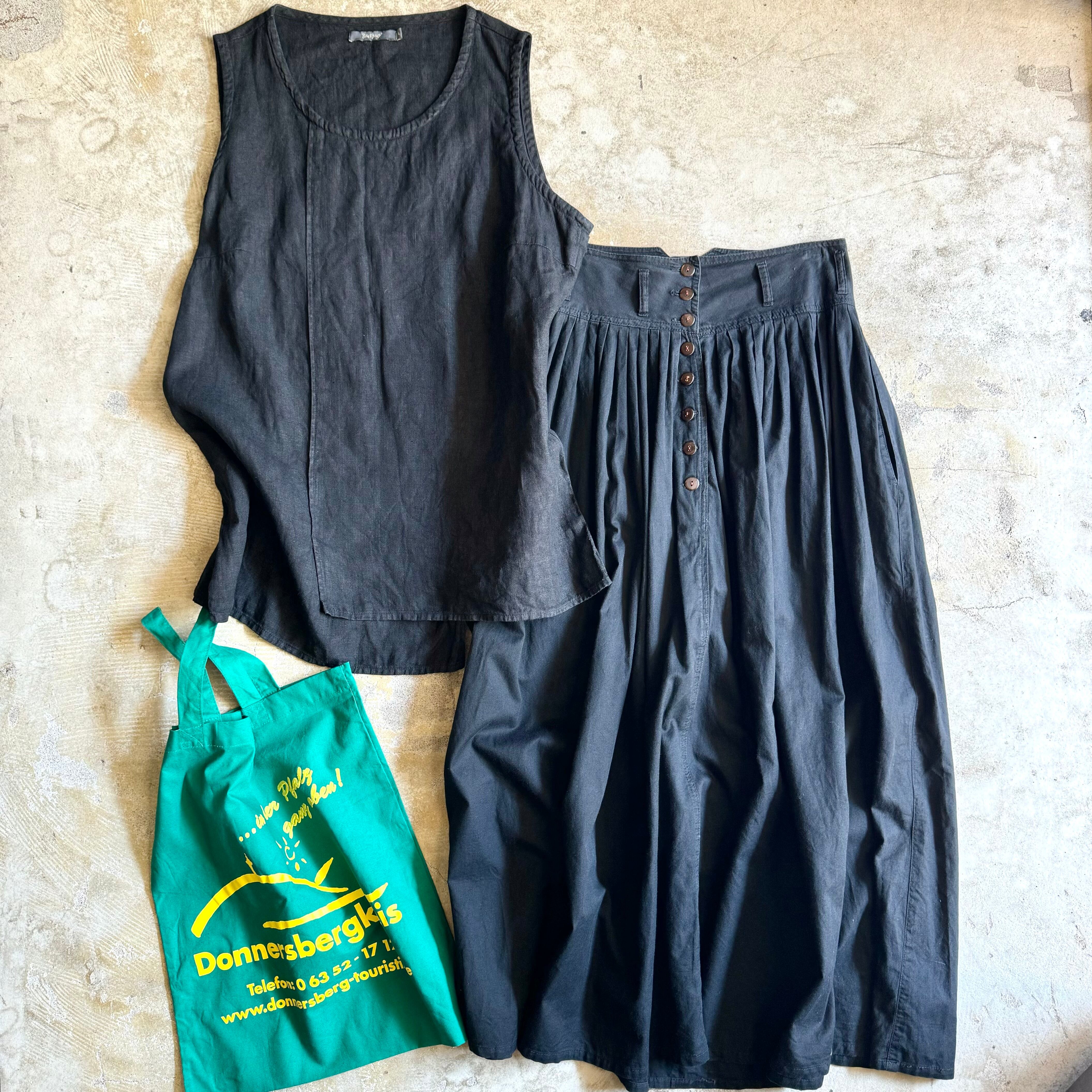 あたたかみのあるブラックの発色が落ち着いた雰囲気のロングスカート。すっきりとしたウエスト周りのデザインと、ふんわり広がりすぎず自然に下に落ちるシルエット、そして長めな丈感が大人っぽい雰囲気です。きれいめにもカジュアルにも様々なコーディネートでお楽しみいただけます。両サイドにポケットが付いているのも嬉しいポイントです。ほぼ通年でお楽しみいただける、さらりとしたしなやかなコットン素材です。裏地は付いていませんが、透け感はありません。