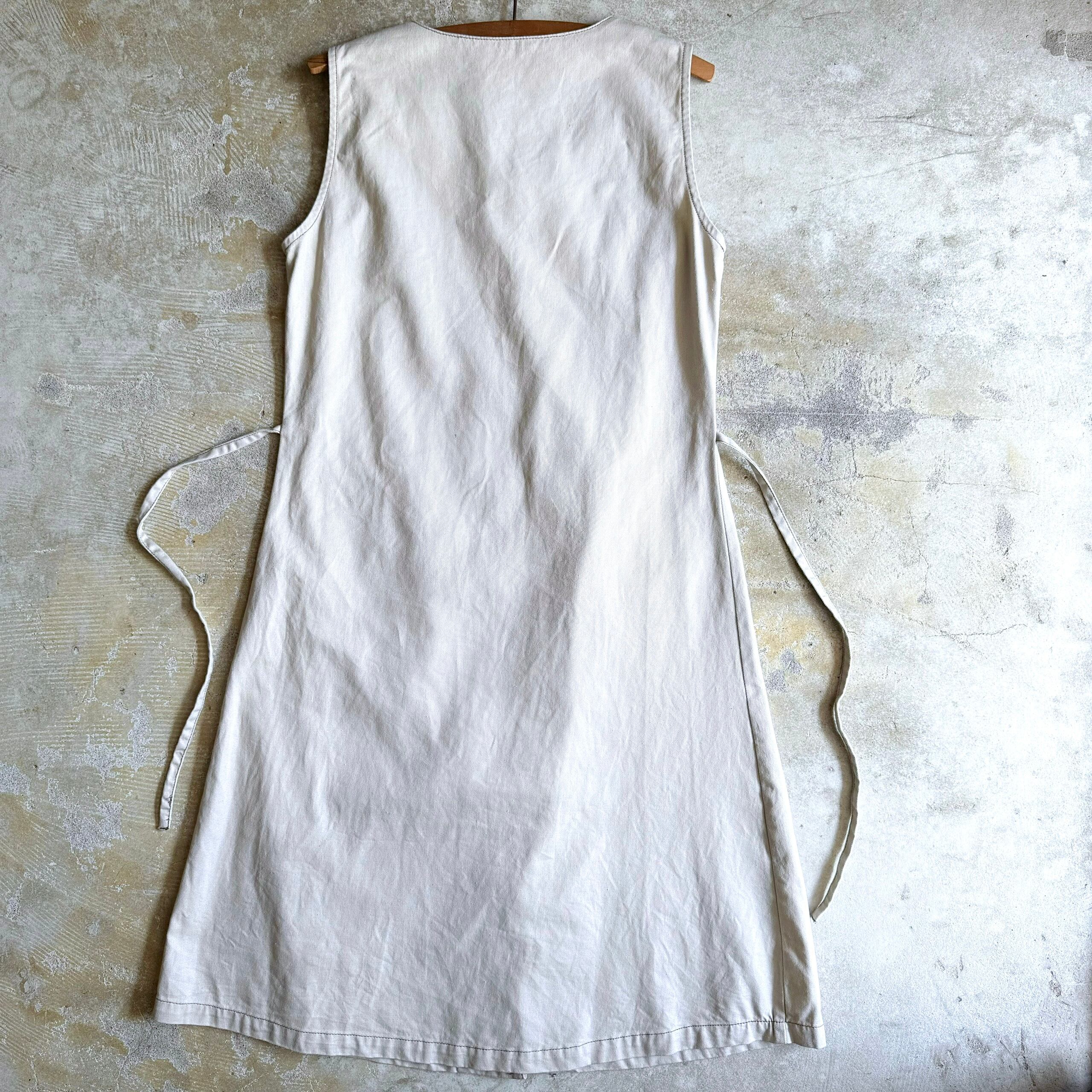優しいアイボリー系の色味が素敵なノースリーブワンピース。そのままワンピースとしてはもちろん、前開きでシンプルなデザインなので、ロングジレのようにお使いいただくのもオススメです。両サイドに付いた紐ベルトを前や後ろで結びことにより、雰囲気の変化もお楽しみいただけます。少しハリのある、コットン素材です。裏地は付いていませんが、透け感はありません。