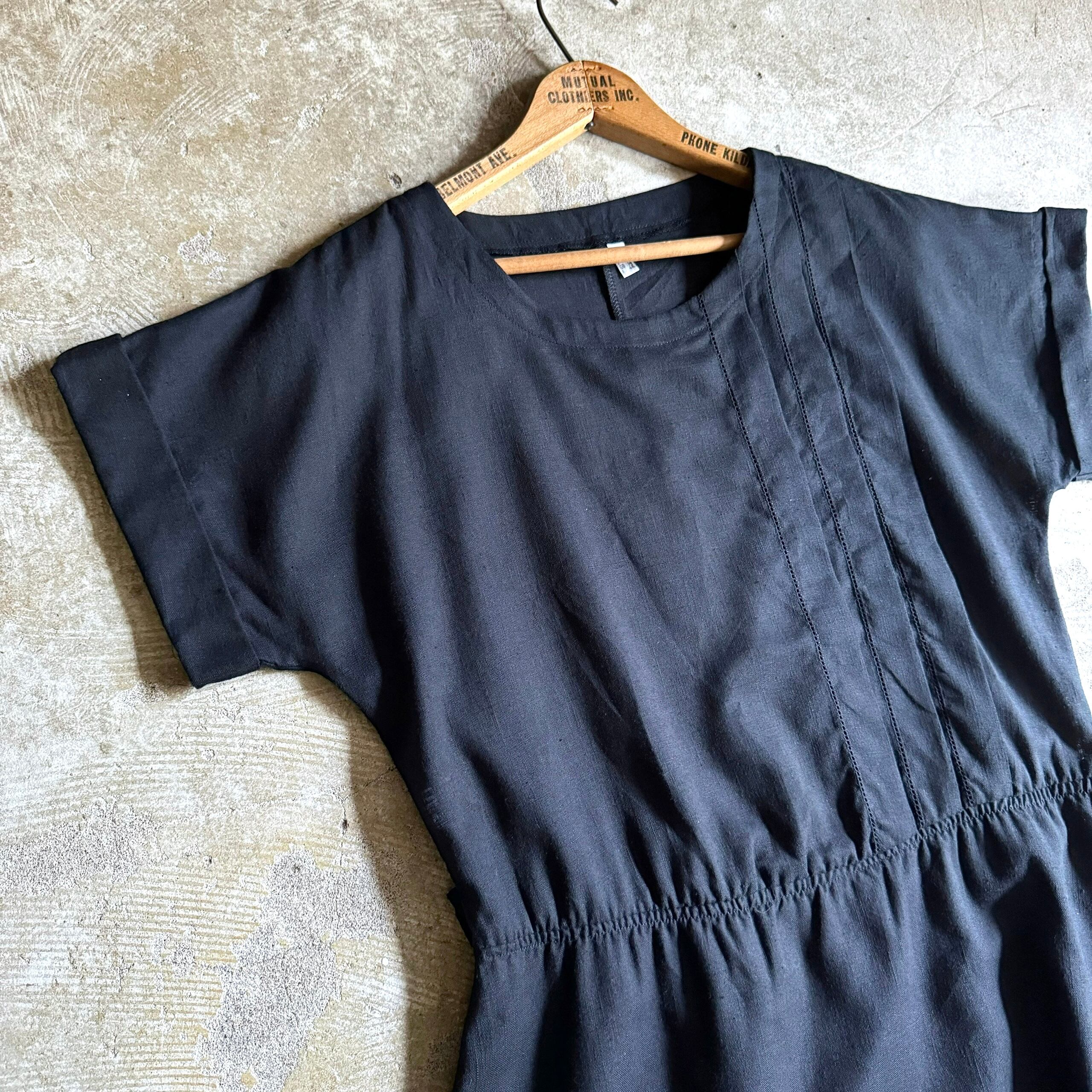 すっきりとしたシンプルなデザインとブラックの色合いがクールな印象のワンピース。肩に沿って自然に落ちる袖と、ゆったりとしたドルマンスリーブ、ふんわり広がりすぎないシルエットが大人っぽい雰囲気です。ベルトループが付いているので、お持ちのベルトでウエストマークすることでシルエットの変化もお楽しみいただけます。少しハリのある、さらりとしたしなやかな素材感です。スカート部分には裏地が付いています。