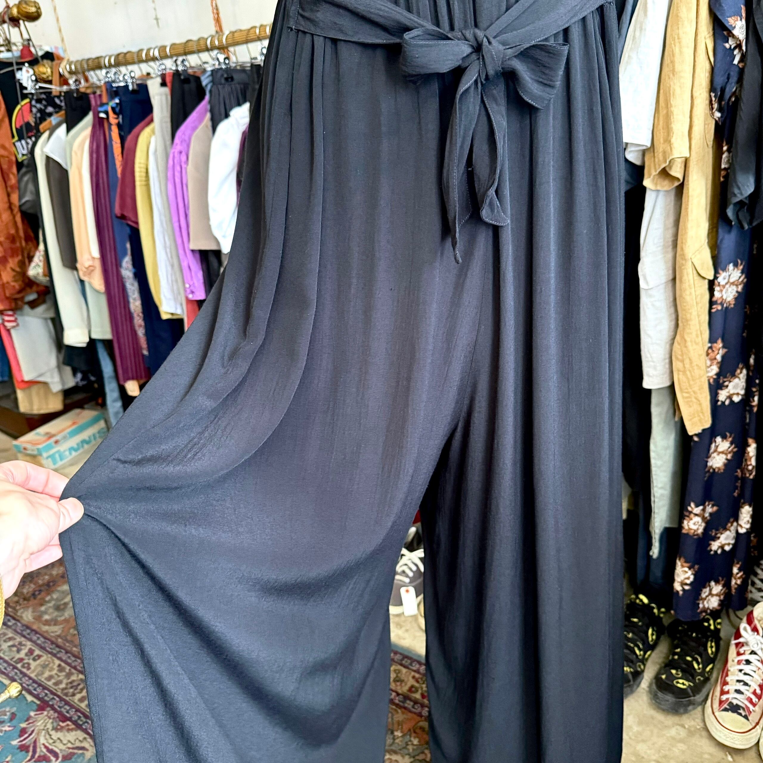 さらっと自然に下に落ちるしなやかな素材感がつくり出す、モード感のある雰囲気が大人っぽいこちら。ブラックワンピースのようですが、ボトムス部分がパンツのオールインワンになります。ワイドサルエルパンツのような股上の深いデザインなので、ほぼワンピースのようにご着用いただけます。少しハイウエストな位置の紐ベルトを後ろや前で結ぶことにより、雰囲気の変化もお楽しみいただけます。身長の高い方にもオススメな、しっかり長めな丈感です。裏地は付いていませんが、ほぼ透け感はありません。