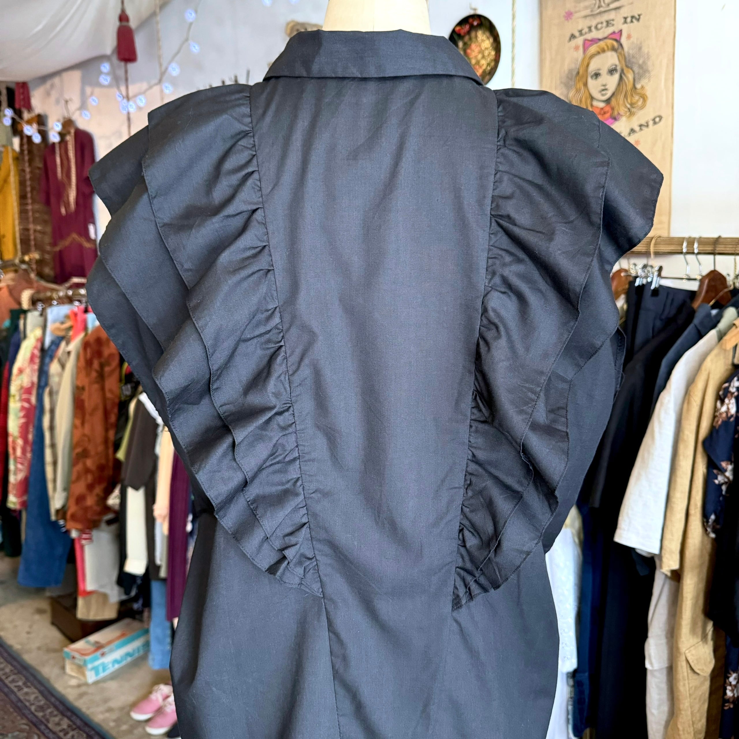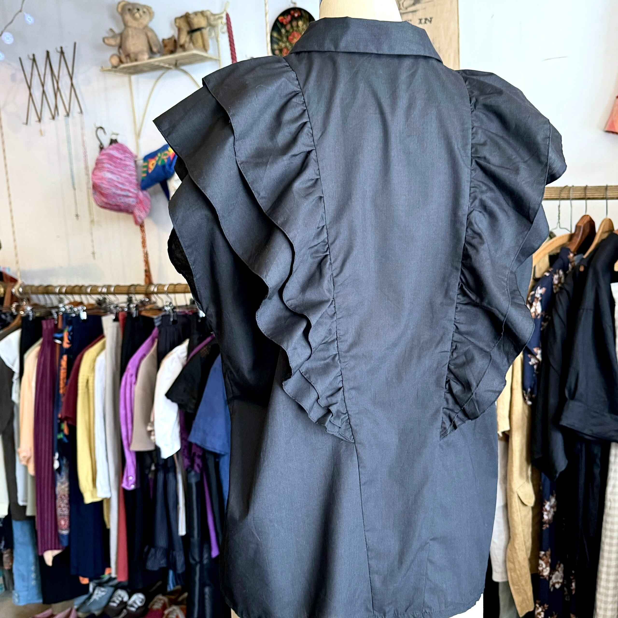 フロントと背中にあしらわれたボリュームのあるフリルが印象的なブラウス。クールな襟のデザインとブラックの色合いが、甘さを軽減しカッコいい雰囲気にしてくれています。肩に沿って自然に落ちる、すっきりとした袖もバランスのいい1着です。様々なボトムスとのコーディネートで、カジュアルにもきれいめにもお楽しみいただけます。少しハリのある、さらりとしたコットン素材です。
