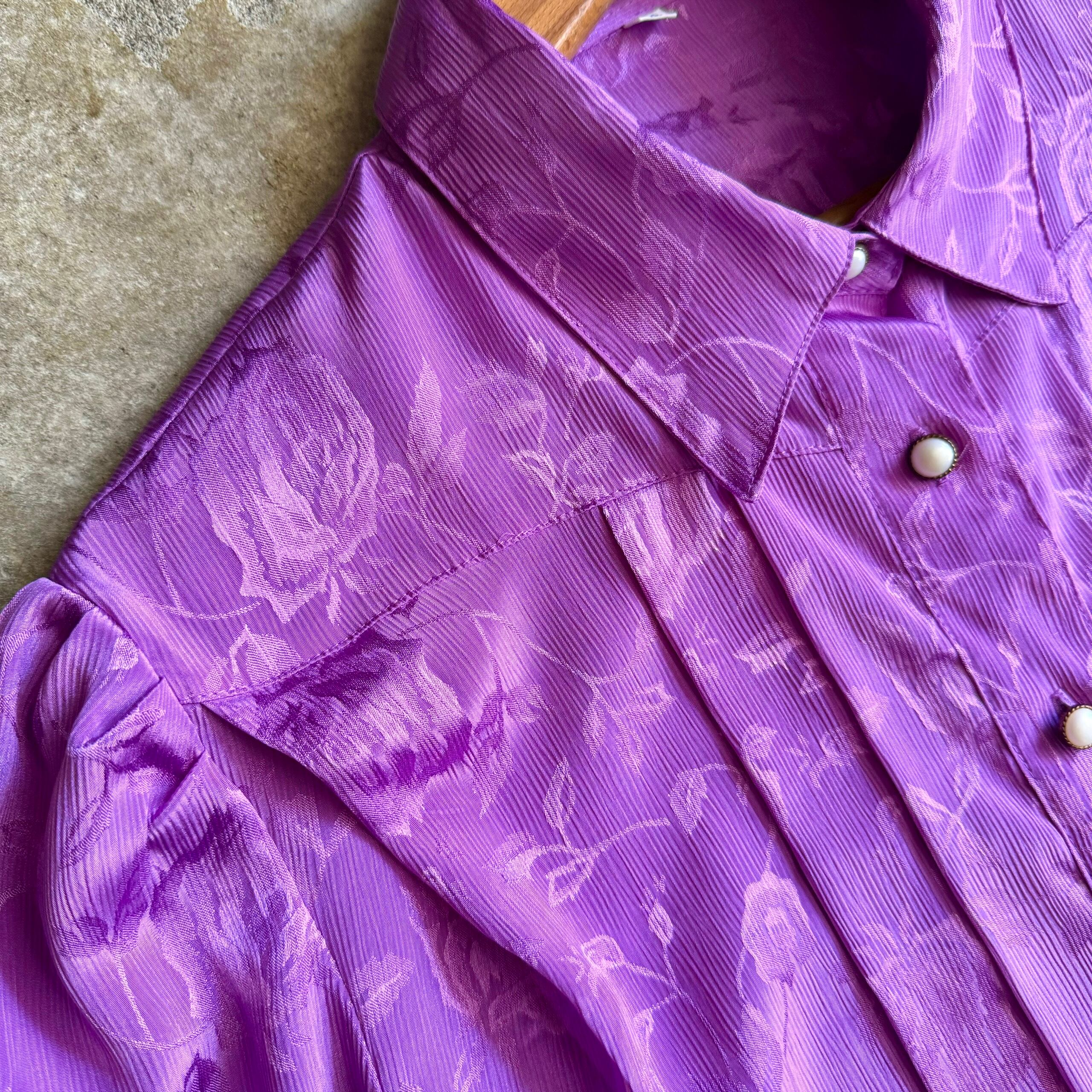 少し光沢感のある、美しいパープル系の色合いがステキなブラウスジャケット。さりげなく描かれた花柄が印象的です。ふんわりとした袖と、ペプラムデザインのような裾。シンプルなようで少しだけ凝ったディテールが印象的です。さらりとしたしなやかな素材感なので、ブラウスとしてはもちろん、Tシャツやワンピース等にゆるやかに羽織るのもオススメです。