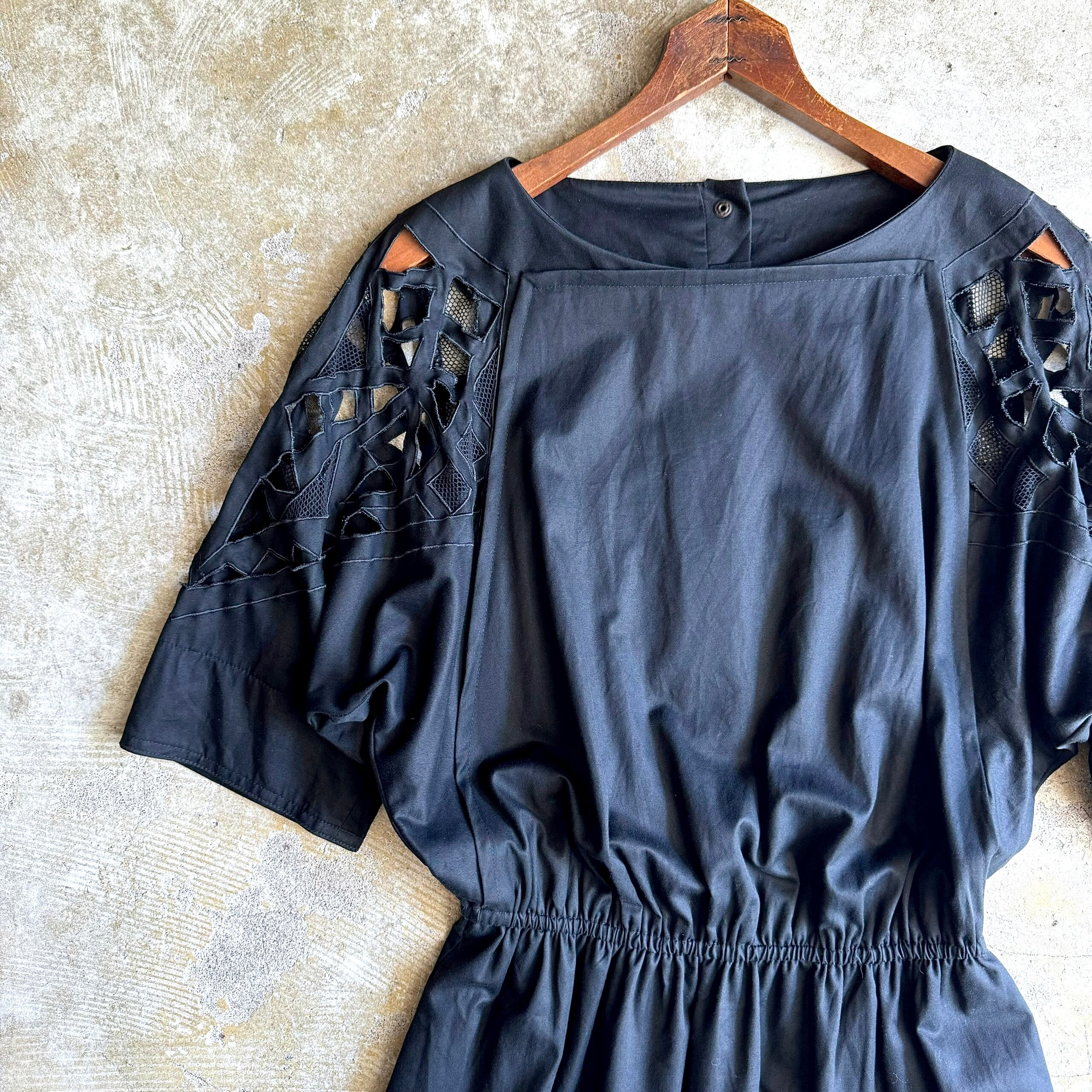 肩から袖にかけての透かし編みのようなデザインが印象的なブラックワンピース。肩に沿って自然に落ちるゆるやかなドルマンスリーブと、すっきりとしたスカート部分のバランスが大人っぽい雰囲気です。さりげない肌見せはもちろん、長袖アイテムをインしたレイヤードコーデもオススメです。両サイドにポケットが付いています。透け感のない、比較的しっかりとしたコットン素材です。スカート部分には裏地が付いています。