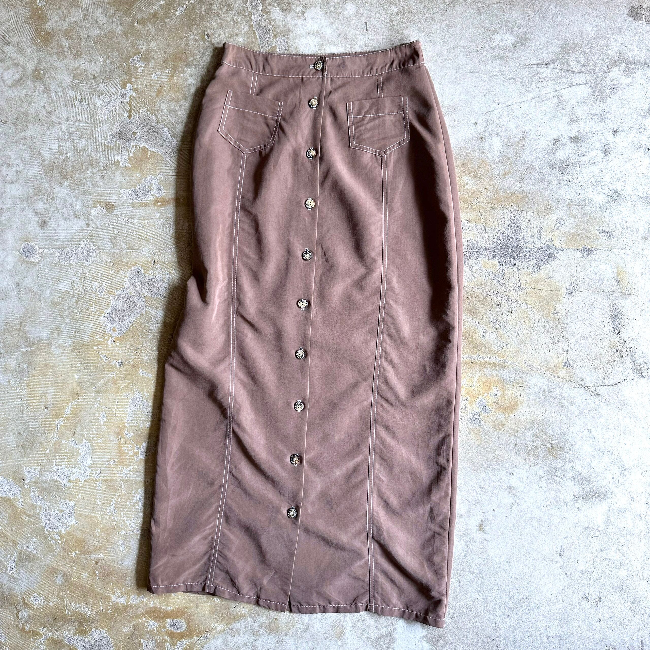 落ち着いた色合いと、フロントのボタンが印象的なロングスカート。長めな丈感と、ふんわりと広がらす自然に下に落ちるシルエットが大人っぽく、きれいめにもカジュアルにも様々な雰囲気でお楽しみいただけます。触ると少しひんやりとするような、さらりとしたしなやかな素材感です。裏地は付いていませんが透け感はありません。