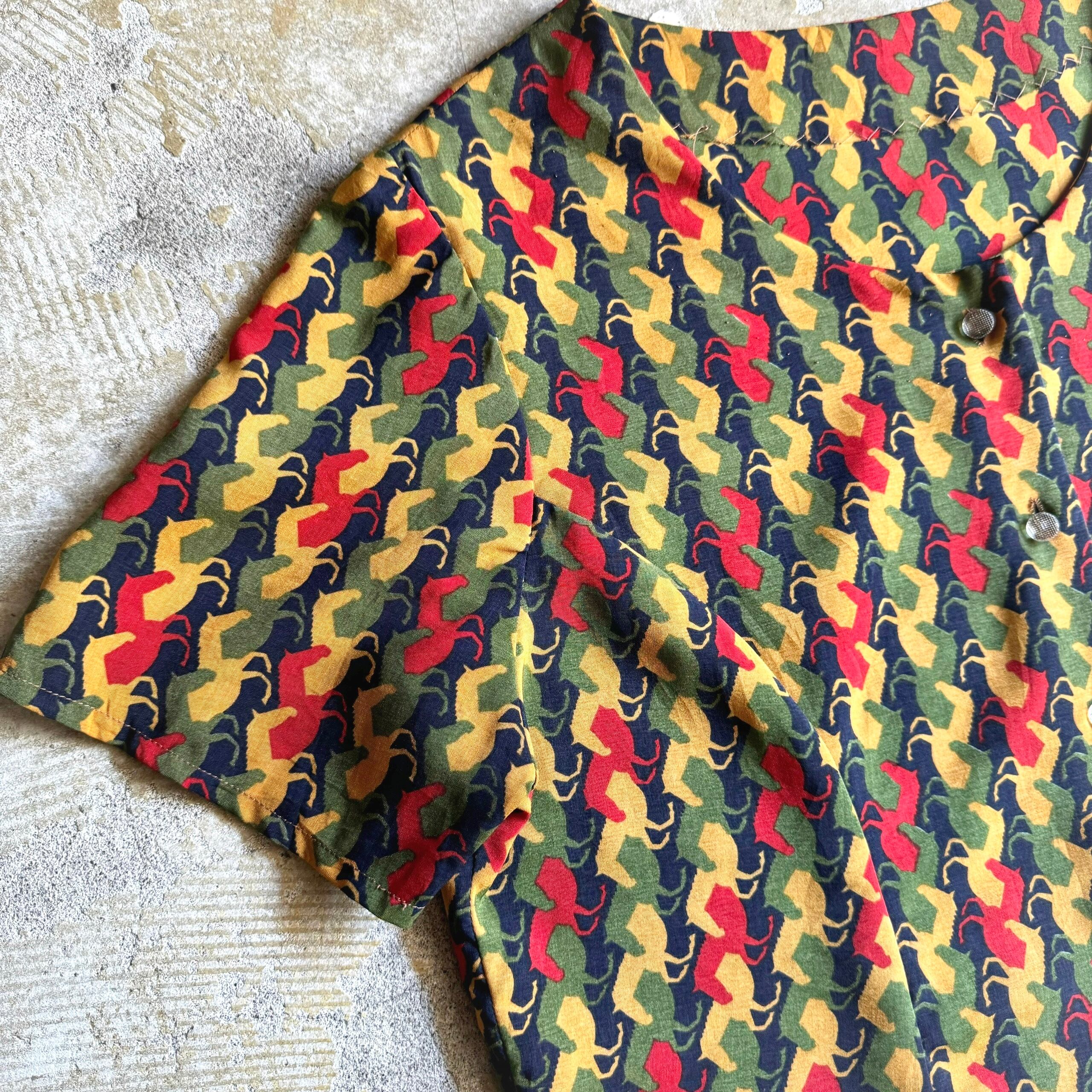 落ち着いた色合いで描かれた柄が印象的なノーカラーブラウス。ゆったりとしたサイズ感なので大人っぽい雰囲気でお楽しみいただけます。ブラウスとしてはもちろん、広めな身幅に対して少し短めな着丈のデザインは、軽めな羽織りアイテムとしてもオススメです。さらりとしたしなやかな素材感です。