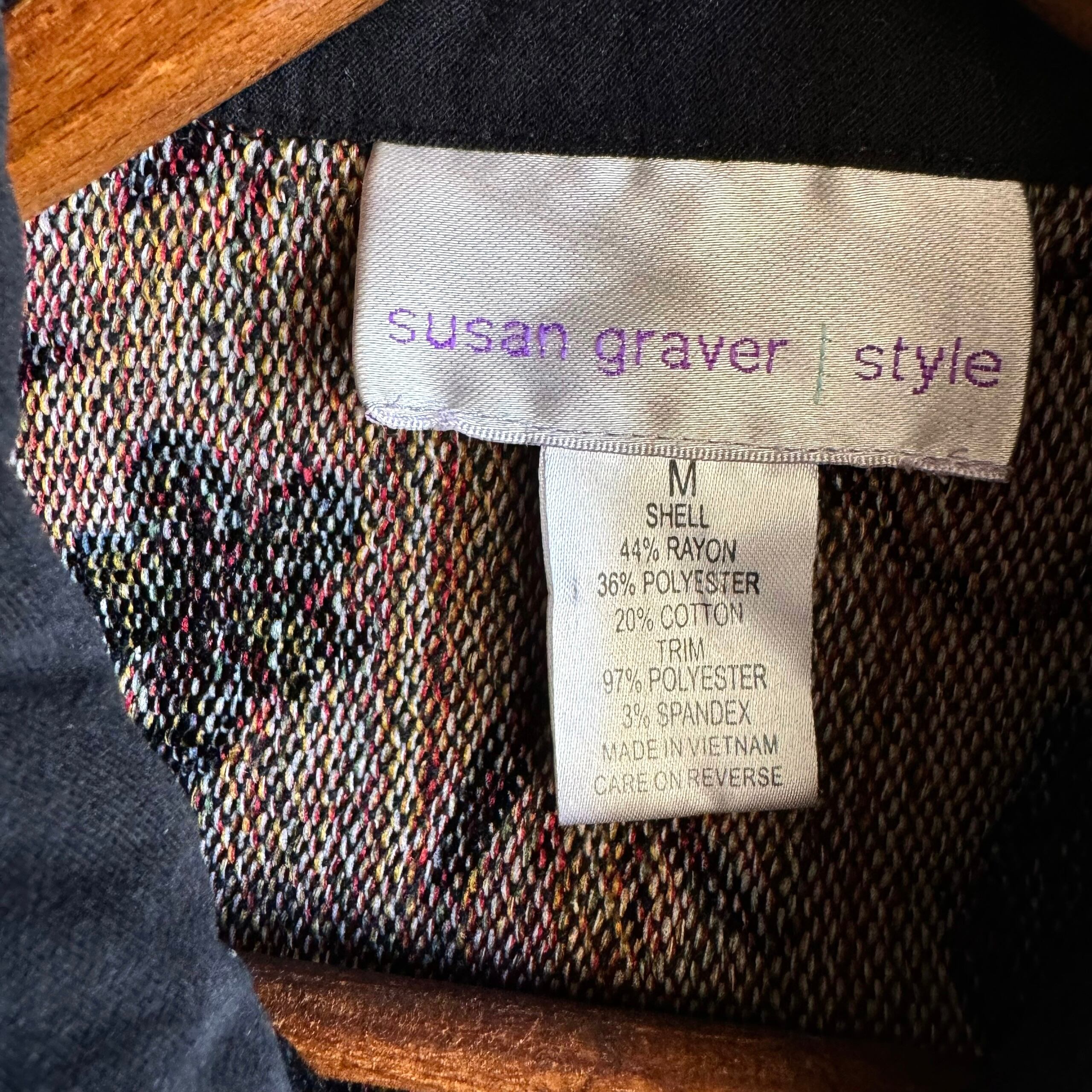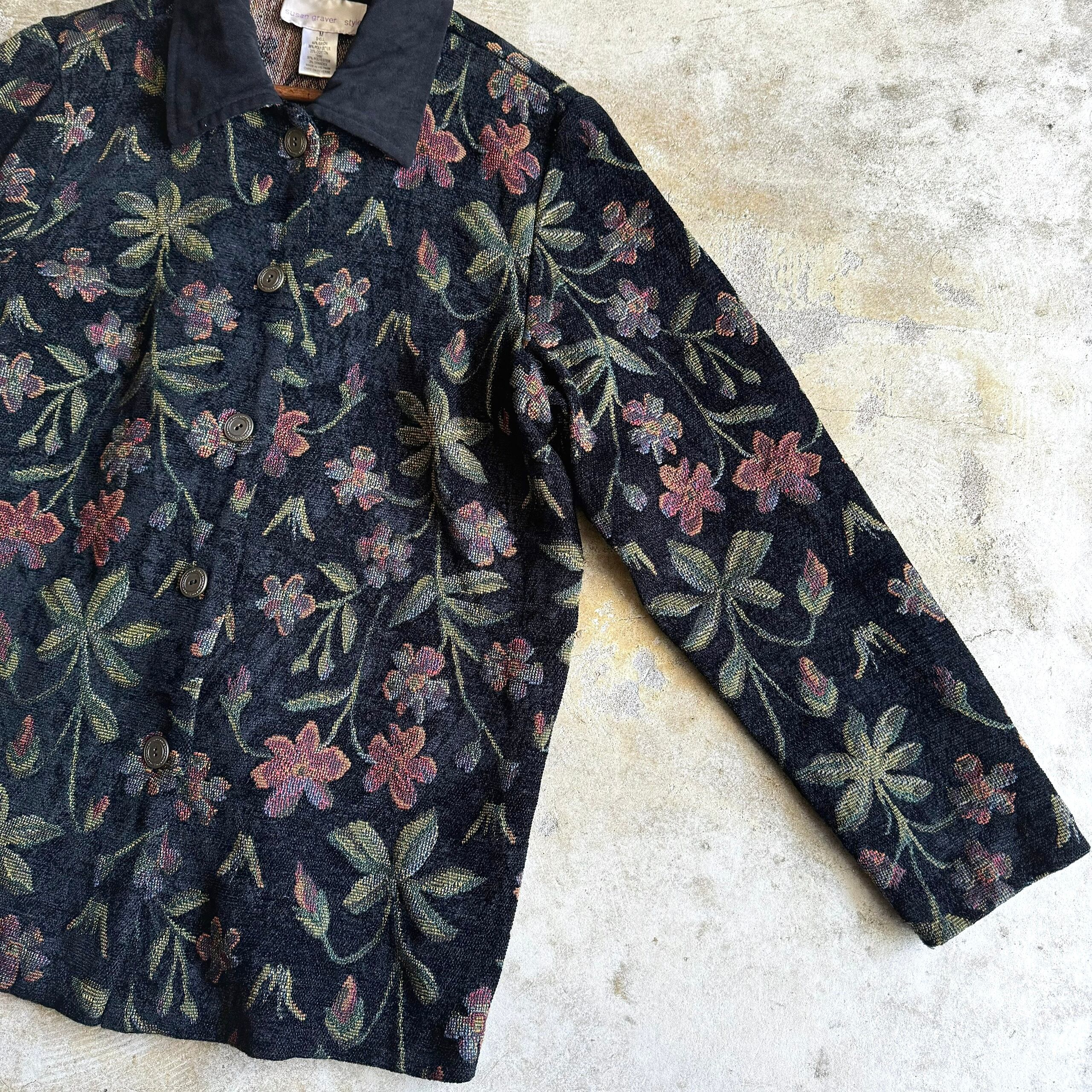 シックなブラックベースに描かれた花柄がステキなジャケット。クラシックな雰囲気でありながら、様々なコーディネートで活躍してくれるシンプルなデザインが魅力的です。適度な厚さで、扱いやすい柔らかなジャガード織は、これからの季節のアウターとしてもオススメです。