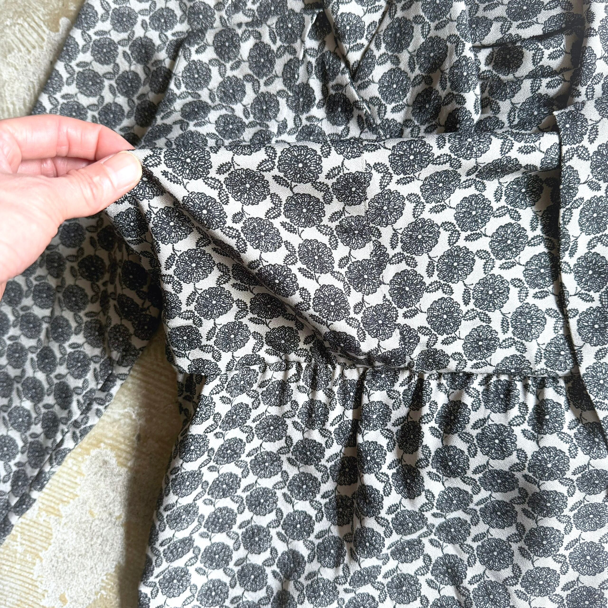 薄いグレー地に、少しネイビーを感じるグレーの色合いで描かれた花のモチーフが落ち着いた雰囲気のデザインワンピース。上品な胸元のドレープ・ボウタイが印象的です。ふんわり広がらず自然に下に落ちるようなシルエットで、パンツを合わせるレイヤードコーデもオススメです。さらりとしたしなやかな素材感です。袖以外に裏地が付いています。