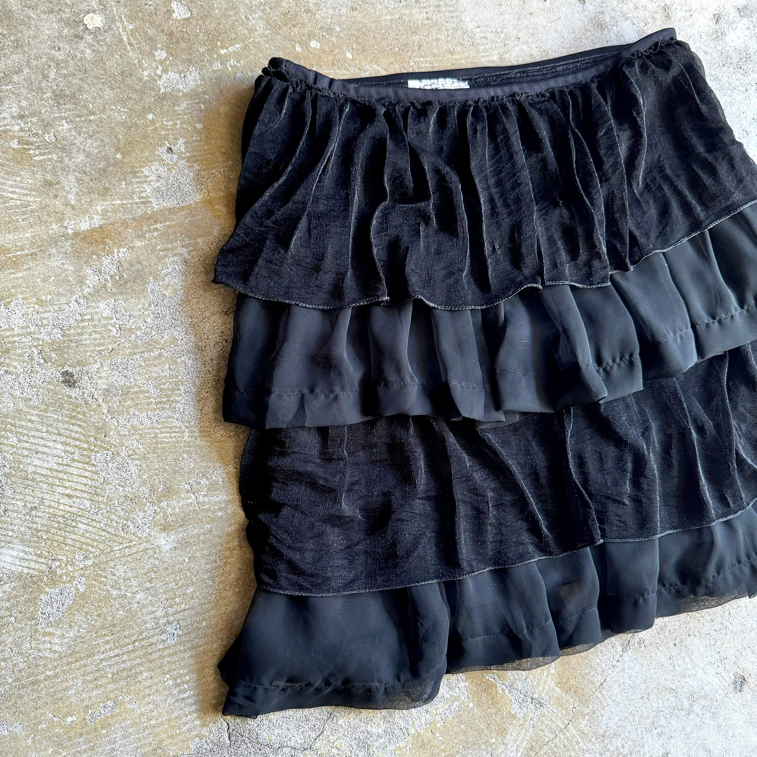 ベースのブラックスカートに、チュールやシフォンのような軽い素材感のフリルが縫い付けられたティアードスカート。すっきりとしたシルエットと、ブラックの色合いが意外に甘くならず、パンツとのレイヤードでお楽しみいただくのもオススメです。きれいめにもカジュアルにも、いつものコーディネートにプラスするだけで雰囲気を変えてくれる1着です。ベースのスカートがあるので、透け感はなく単体でもお楽しみいただけます。