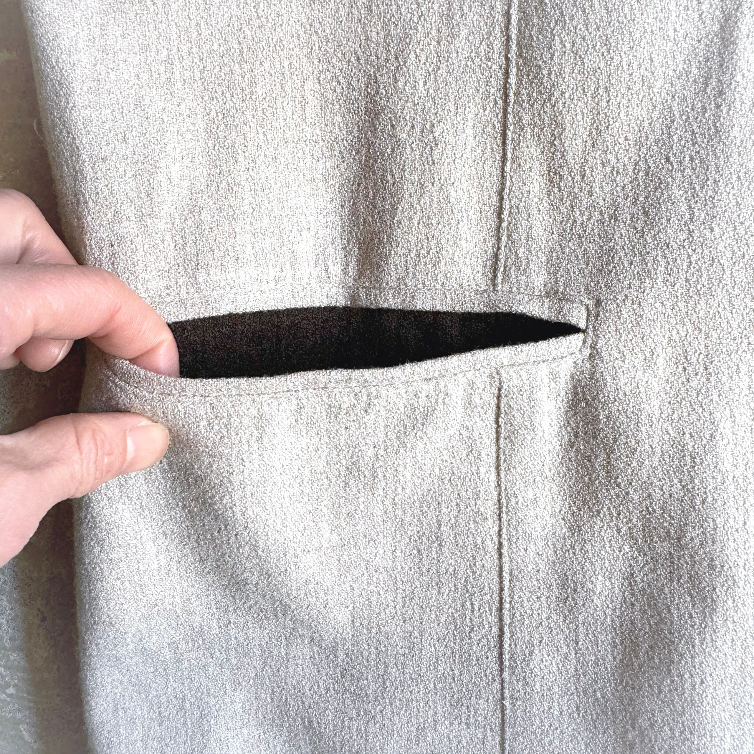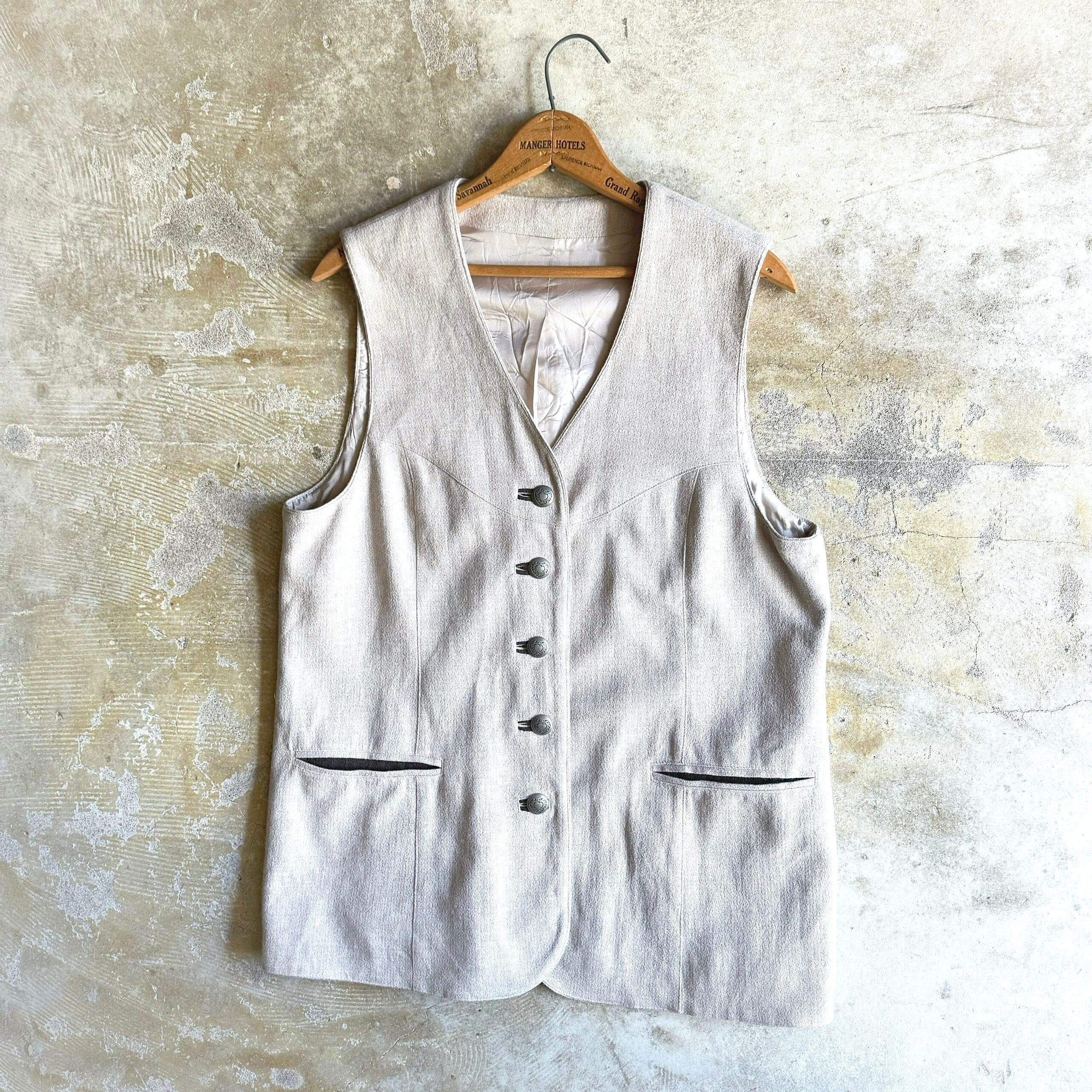優しいアイボリー系の色合いが素敵なロングジレ。ハートモチーフのボタンや、ブラウンのボタンホールとポケットがさりげないアクセントになっています。縦のラインがきれいなすっきりとしたシルエットながら、アームホールと身幅が広めなデザインなので、ニットやスウェット、軽めなジャケットとのレイヤードもお楽しみいただけます。あたたかみのある柔らかなウール混素材です。裏地が付いています。