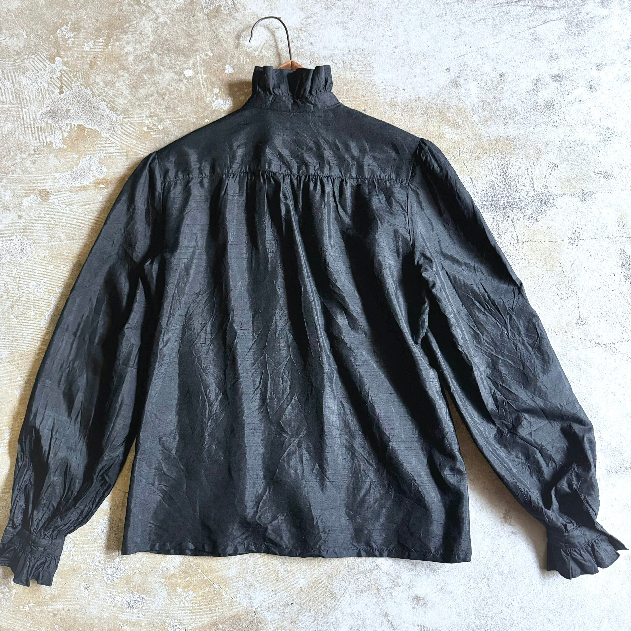 落ち着いたブラックの色合いがクラシックな雰囲気のブラウス。首元と袖口のさりげないフリル、適度なボリュームスリーブが大人っぽく上品な印象です。カジュアルにもきれいめにも様々なコーディネートでお楽しみいただけます。さらりとしたシルクのようなシャリッとした素材感です。