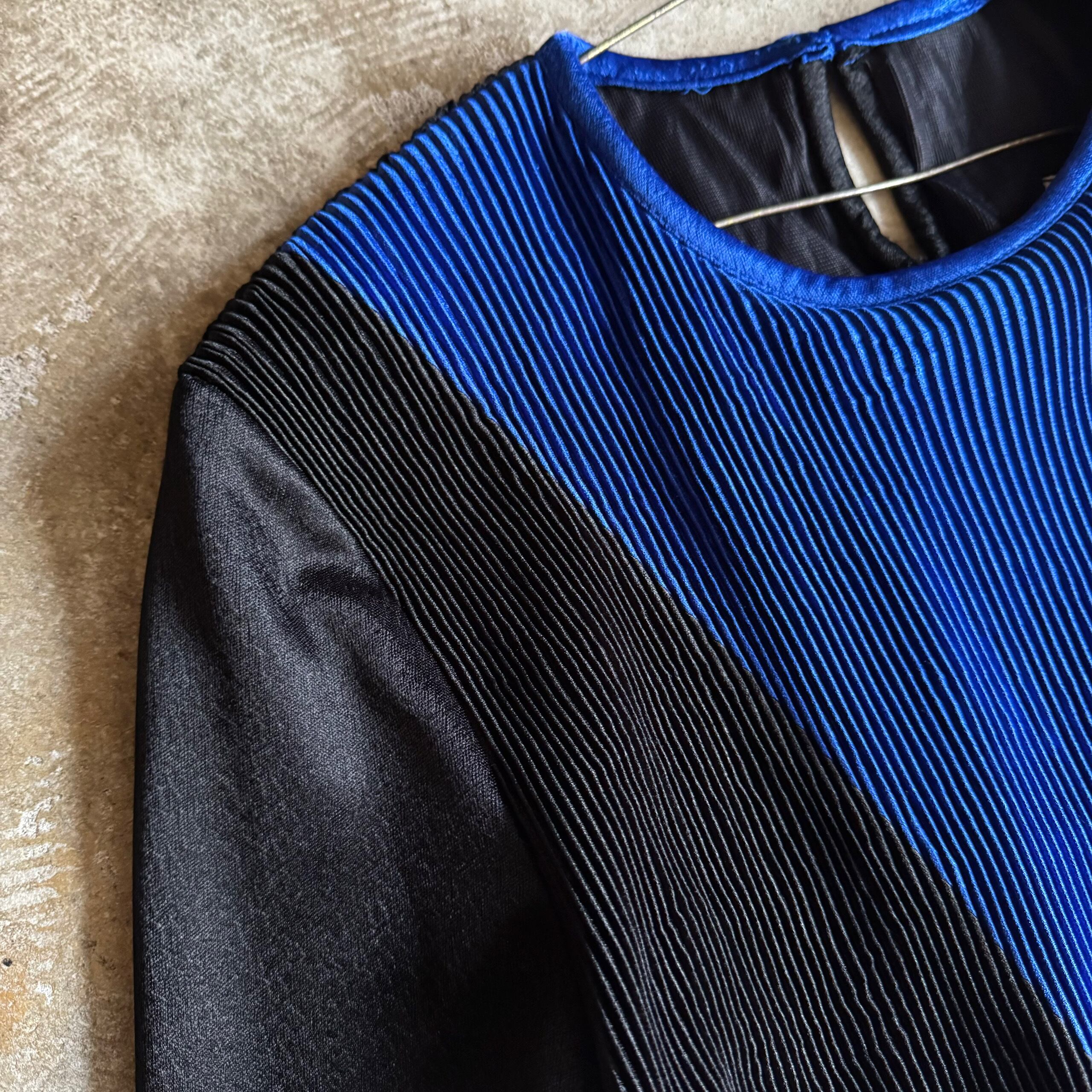 落ち着いたブラックとブルーの色合いがシックなワンピース。袖以外に施された細かなプリーツが印象的です。自然に下に落ちるストレートなシルエットが大人っぽく、カジュアルやモード、小物の合わせ方によってはきちんとしたお席のドレスとしてもお使いいただけます。パンツを合わせたスタイリングもオススメです。薄手すぎず、柔らかくしなやかな素材感のプリーツ加工は、洗濯の際に崩れない点も嬉しいポイントです。トップス部分に裏地が付いていますが、全体的に透け感はありません。