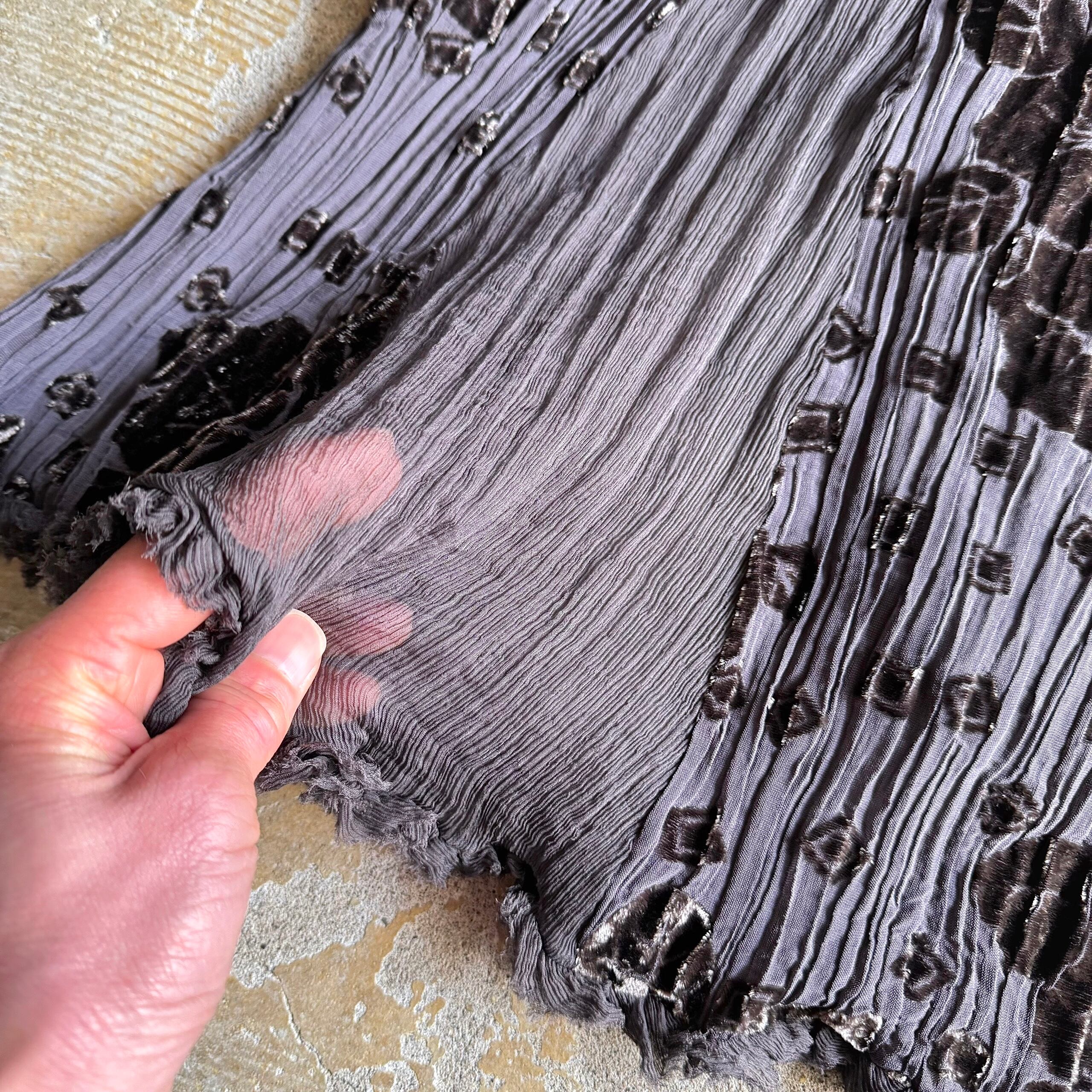 グレーに少しパープルを感じるような絶妙な色合いが素敵なシアースカート。ベロア素材であしらわれたフラワーモチーフが大人っぽい雰囲気です。シアー感とランダムな裾のデザインを活かして、パンツとのレイヤードコーデもオススメです。柔らかくしなやかな素材感です。透け感がありますので、ボトムスとの重ね着やインナーのご着用をお勧め致します。