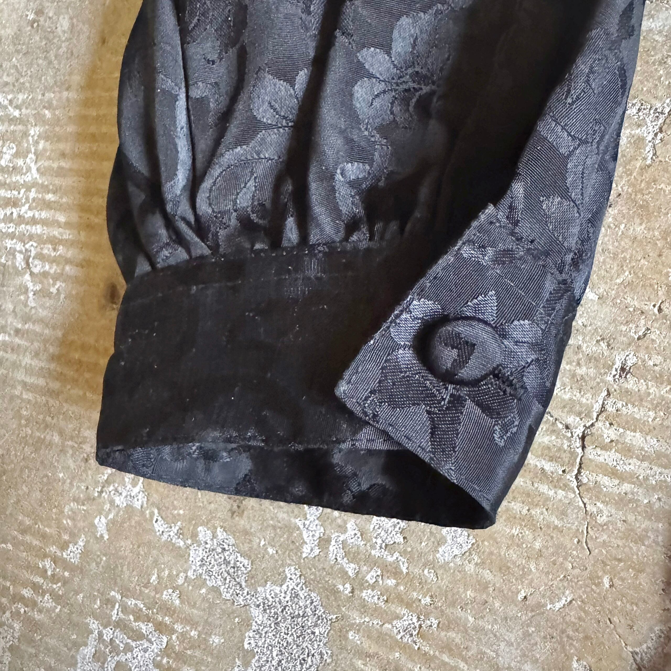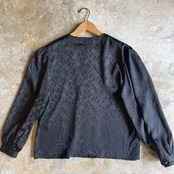 落ち着いたブラックの色合いがクラシックな雰囲気のブラウス。すっきりとしたノーカラーの首元と適度なボリュームスリーブ、控えめに描かれた花の地模様が大人っぽく上品な印象です。カジュアルにもきれいめにも様々なコーディネートでお楽しみいただけます。少し光沢のある、さらりとしたしなやかな素材感です。