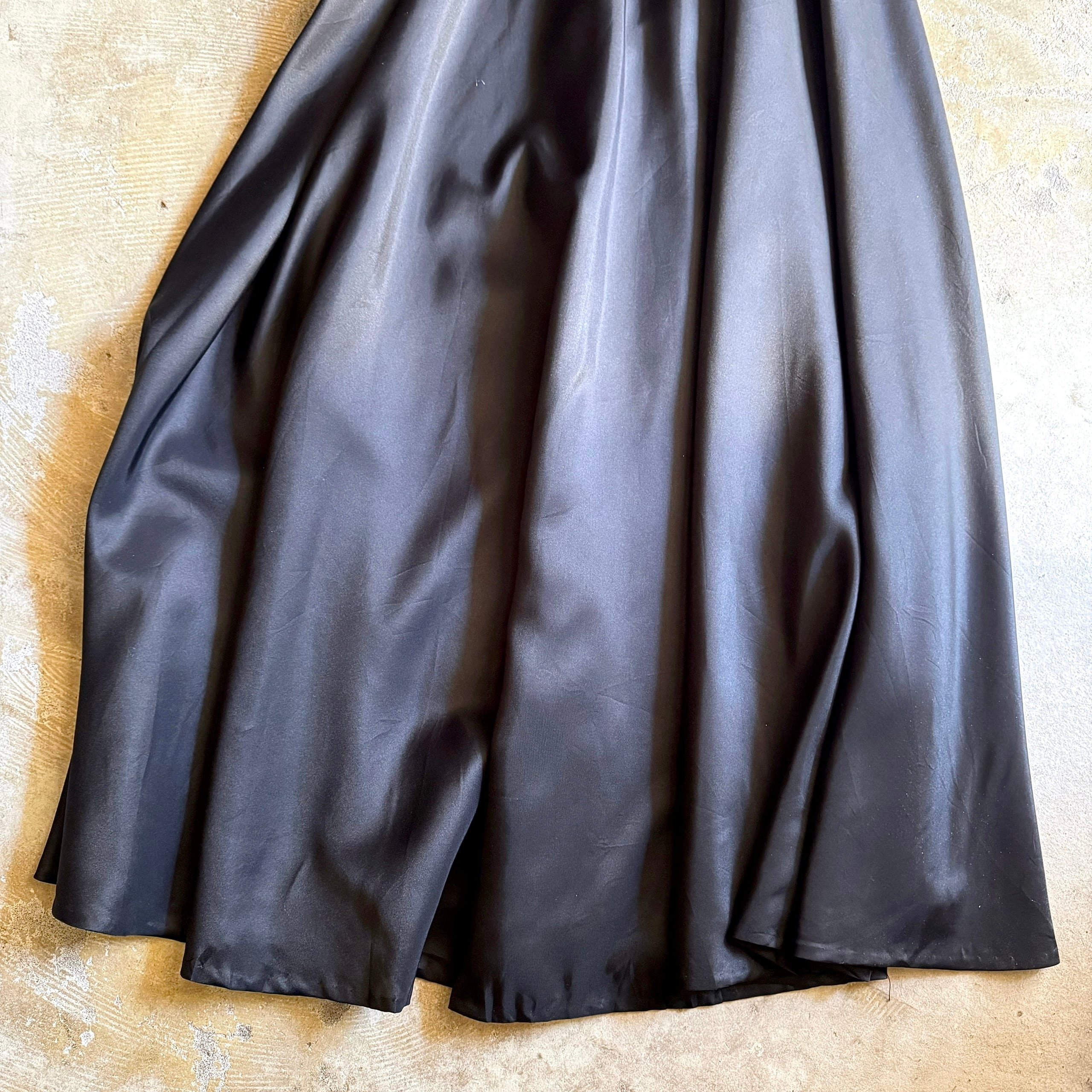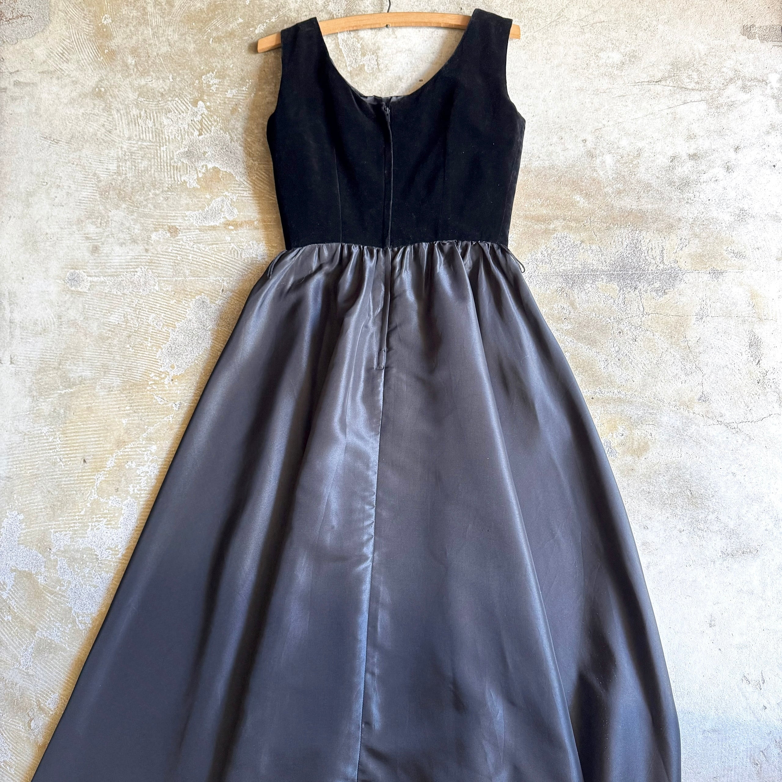 ブラックベロアのトップス部分と、光沢のあるブラックシルクのような素材感のスカート部分の組合せが素敵なノースリーブドレス。身長の高い方にもオススメなマキシ丈が雰囲気のある1着です。様々なインナーと合わせてカジュアルにお楽しみいただくのはもちろん、きちんとしたお席でのドレスとしてもお使いいただけます。トップス部分には裏地が付いています。スカート部分には裏地が付いていませんが、ほぼ透け感はありません。