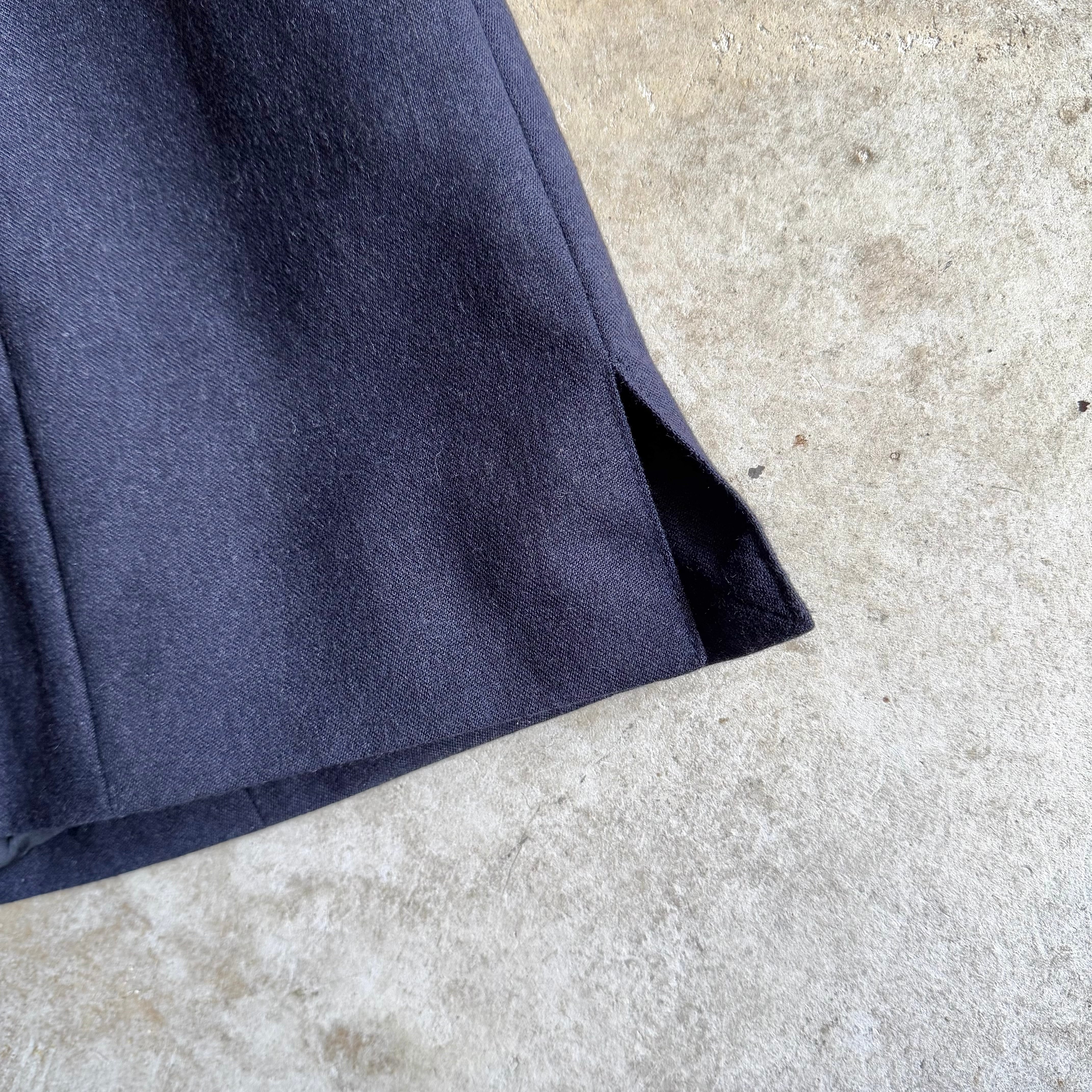 深みのあるネイビーの色合いがシックなデザインベスト。さりげない金ボタンと、少し長めな着丈が大人っぽい雰囲気です。縦のラインがきれいなすっきりとしたシルエットながら、アームホールと身幅が広めなデザインなので、スウェットや軽めなジャケットとのレイヤードもお楽しみいただけます。厚手すぎず扱いやすい柔らかなウール素材は、これからの季節のアクセントになってくれる1着です。