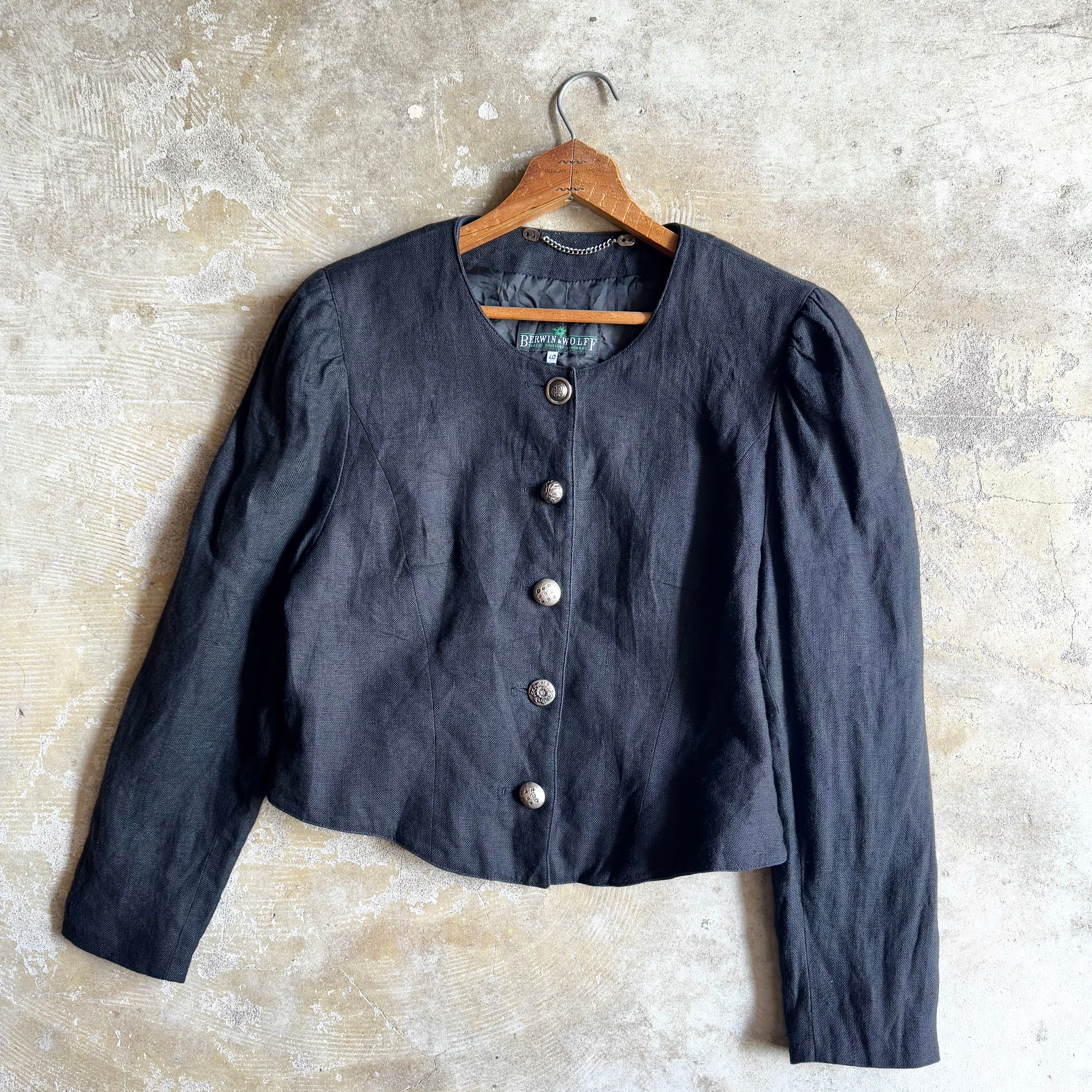 リネン特有のチャコールに近い柔らかなブラックの発色がシックなショート丈ジャケット。デザインの異なるチャームボタンや、程よいパフスリーブ等、さりげなく凝ったチロルらしいディテールが印象的です。スカートやワンピースに合わせて女性らしくはもちろん、Tシャツ・デニムパンツにさっと羽織るカジュアルコーデもオススメです。裏地が付いたリネンなので、幅広い季節でお使いいただけます。