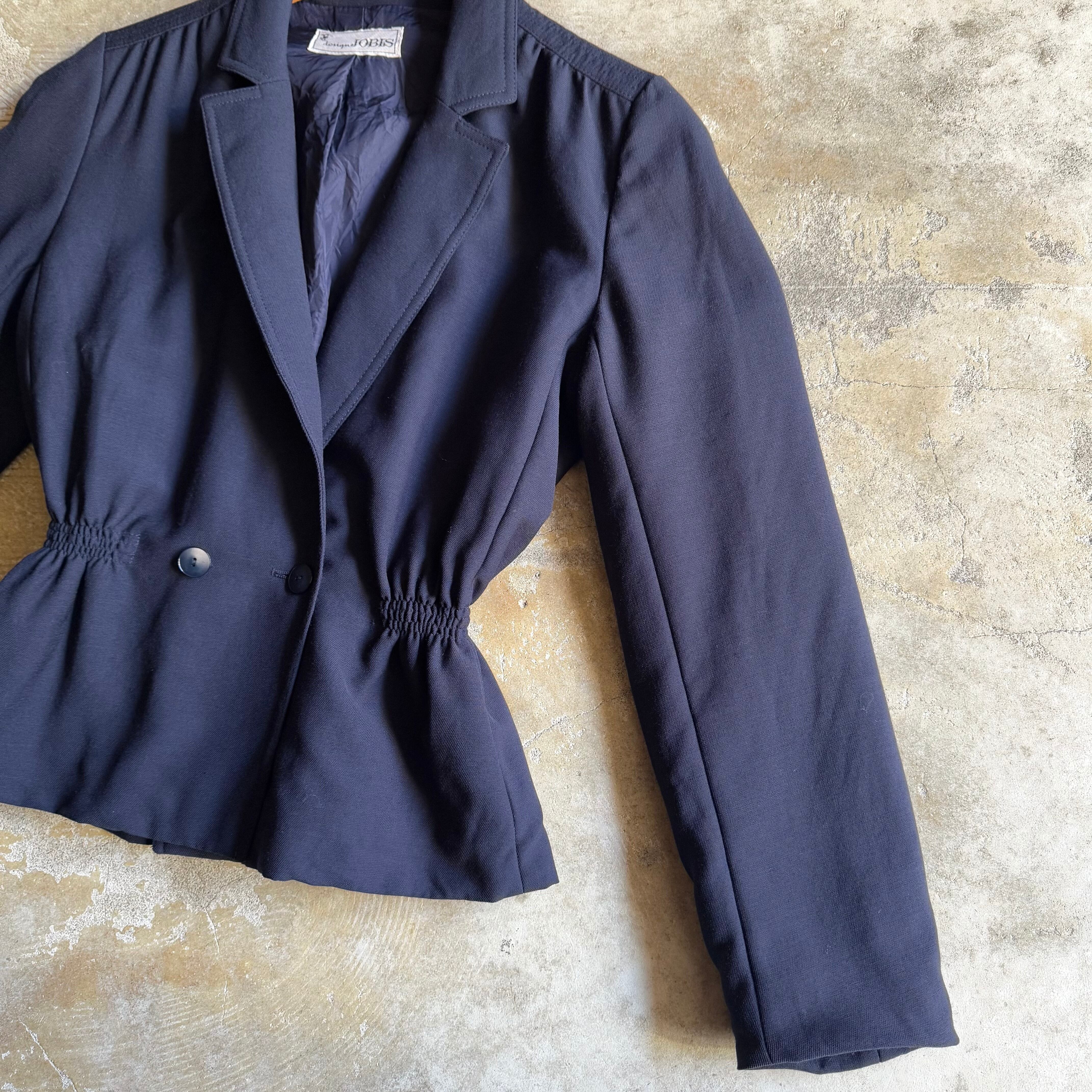 シックなネイビーの色合いが落ち着いた印象のジャケット。ゴムでウエストがキュッとシェイプされ、ブラウジングしたようなデザインになります。ベルトループが付いていますので、お持ちのベルトを通して雰囲気の変化もお楽しみいただけます。きれいめにはもちろん、Tシャツ・デニムパンツにさっと羽織るカジュアルコーデもオススメです。厚手すぎない柔らかなウール素材なので、幅広い季節でお使いいただけます。全体的に裏地が付いています。